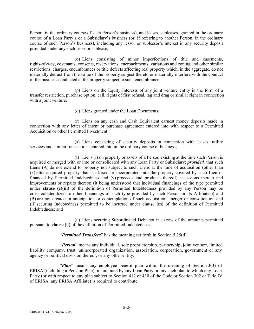 Person, in the ordinary course of such Person’s business), and leases, subleases, granted in the ordinary course of a Loan Party’s or a Subsidiary’s business (or, if referring to another Person, in the ordinary course of such Person’s business), including any lessor or sublessor’s interest in any security deposit provided under any such lease or sublease; (o) Liens consisting of minor imperfections of title and easements, rights-of-way, covenants, consents, reservations, encroachments, variations and zoning and other similar restrictions, charges, encumbrances or title defects affecting real property which, in the aggregate, do not materially detract from the value of the property subject thereto or materially interfere with the conduct of the business conducted at the property subject to such encumbrance; (p) Liens on the Equity Interests of any joint venture entity in the form of a transfer restriction, purchase option, call, rights of first refusal, tag and drag or similar right in connection with a joint venture; (q) Liens granted under the Loan Documents; (r) Liens on any cash and Cash Equivalent earnest money deposits made in connection with any letter of intent or purchase agreement entered into with respect to a Permitted Acquisition or other Permitted Investment; (s) Liens consisting of security deposits in connection with leases, utility services and similar transactions entered into in the ordinary course of business; (t) Liens (i) on property or assets of a Person existing at the time such Person is acquired or merged with or into or consolidated with any Loan Party or Subsidiary; provided, that such Liens (A) do not extend to property not subject to such Liens at the time of acquisition (other than (x) after-acquired property that is affixed or incorporated into the property covered by such Lien or financed by Permitted Indebtedness and (y) proceeds and products thereof, accessions thereto and improvements or repairs thereon (it being understood that individual financings of the type permitted under clause (c)(iii) of the definition of Permitted Indebtedness provided by any Person may be cross-collateralized to other financings of such type provided by such Person or its Affiliates)) and (B) are not created in anticipation or contemplation of such acquisition, merger or consolidation and (ii) securing Indebtedness permitted to be incurred under clause (m) of the definition of Permitted Indebtedness; and (u) Liens securing Subordinated Debt not in excess of the amounts permitted pursuant to clause (k) of the definition of Permitted Indebtedness. “Permitted Transfers” has the meaning set forth in Section 5.25(d). “Person” means any individual, sole proprietorship, partnership, joint venture, limited liability company, trust, unincorporated organization, association, corporation, government or any agency or political division thereof, or any other entity. “Plan” means any employee benefit plan within the meaning of Section 3(3) of ERISA (including a Pension Plan), maintained by any Loan Party or any such plan to which any Loan Party (or with respect to any plan subject to Section 412 or 430 of the Code or Section 302 or Title IV of ERISA, any ERISA Affiliate) is required to contribute. B-26 140690.01141/153967960v.25