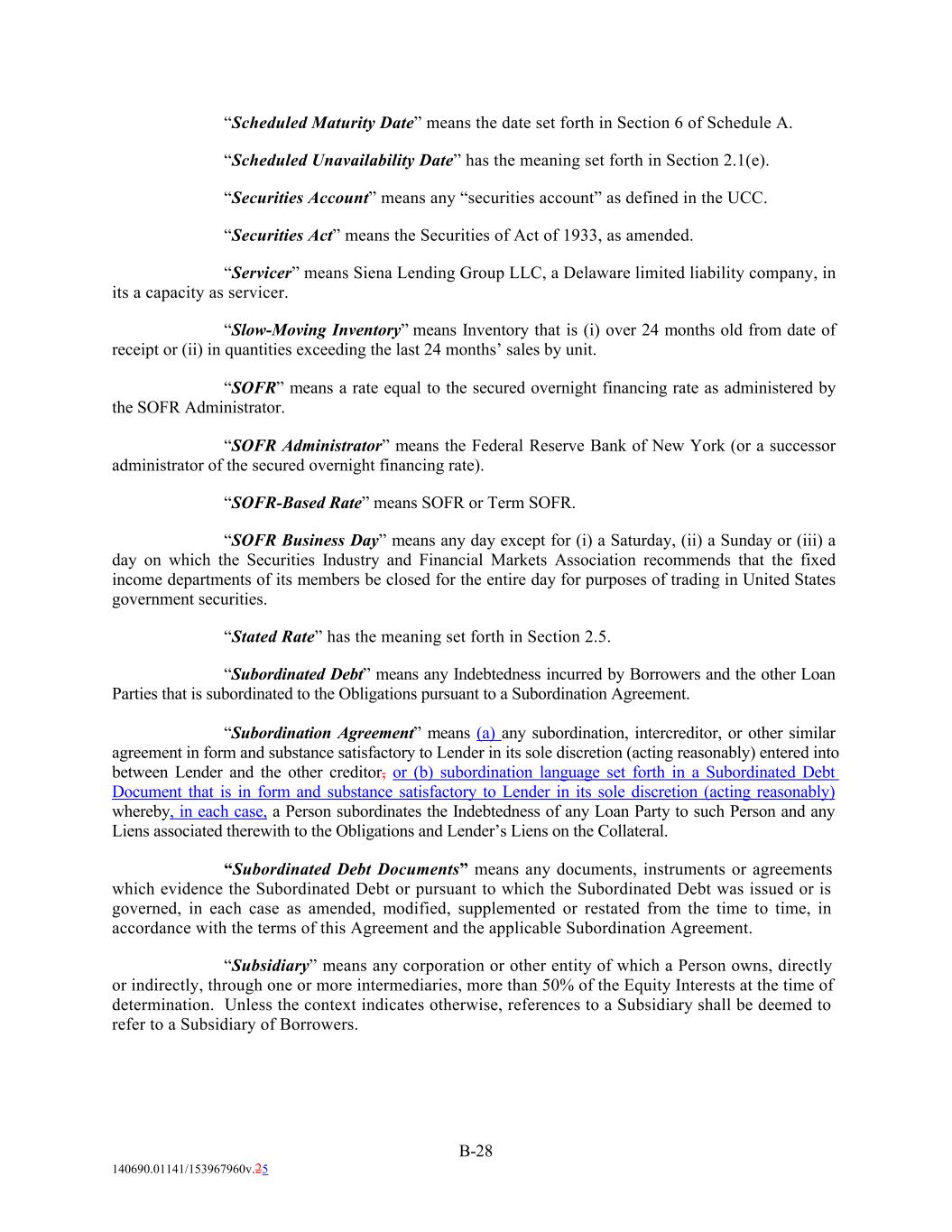 “Scheduled Maturity Date” means the date set forth in Section 6 of Schedule A. “Scheduled Unavailability Date” has the meaning set forth in Section 2.1(e). “Securities Account” means any “securities account” as defined in the UCC. “Securities Act” means the Securities of Act of 1933, as amended. “Servicer” means Siena Lending Group LLC, a Delaware limited liability company, in its a capacity as servicer. “Slow-Moving Inventory” means Inventory that is (i) over 24 months old from date of receipt or (ii) in quantities exceeding the last 24 months’ sales by unit. “SOFR” means a rate equal to the secured overnight financing rate as administered by the SOFR Administrator. “SOFR Administrator” means the Federal Reserve Bank of New York (or a successor administrator of the secured overnight financing rate). “SOFR-Based Rate” means SOFR or Term SOFR. “SOFR Business Day” means any day except for (i) a Saturday, (ii) a Sunday or (iii) a day on which the Securities Industry and Financial Markets Association recommends that the fixed income departments of its members be closed for the entire day for purposes of trading in United States government securities. “Stated Rate” has the meaning set forth in Section 2.5. “Subordinated Debt” means any Indebtedness incurred by Borrowers and the other Loan Parties that is subordinated to the Obligations pursuant to a Subordination Agreement. “Subordination Agreement” means (a) any subordination, intercreditor, or other similar agreement in form and substance satisfactory to Lender in its sole discretion (acting reasonably) entered into between Lender and the other creditor, or (b) subordination language set forth in a Subordinated Debt Document that is in form and substance satisfactory to Lender in its sole discretion (acting reasonably) whereby, in each case, a Person subordinates the Indebtedness of any Loan Party to such Person and any Liens associated therewith to the Obligations and Lender’s Liens on the Collateral. “Subordinated Debt Documents” means any documents, instruments or agreements which evidence the Subordinated Debt or pursuant to which the Subordinated Debt was issued or is governed, in each case as amended, modified, supplemented or restated from the time to time, in accordance with the terms of this Agreement and the applicable Subordination Agreement. “Subsidiary” means any corporation or other entity of which a Person owns, directly or indirectly, through one or more intermediaries, more than 50% of the Equity Interests at the time of determination. Unless the context indicates otherwise, references to a Subsidiary shall be deemed to refer to a Subsidiary of Borrowers. B-28 140690.01141/153967960v.25