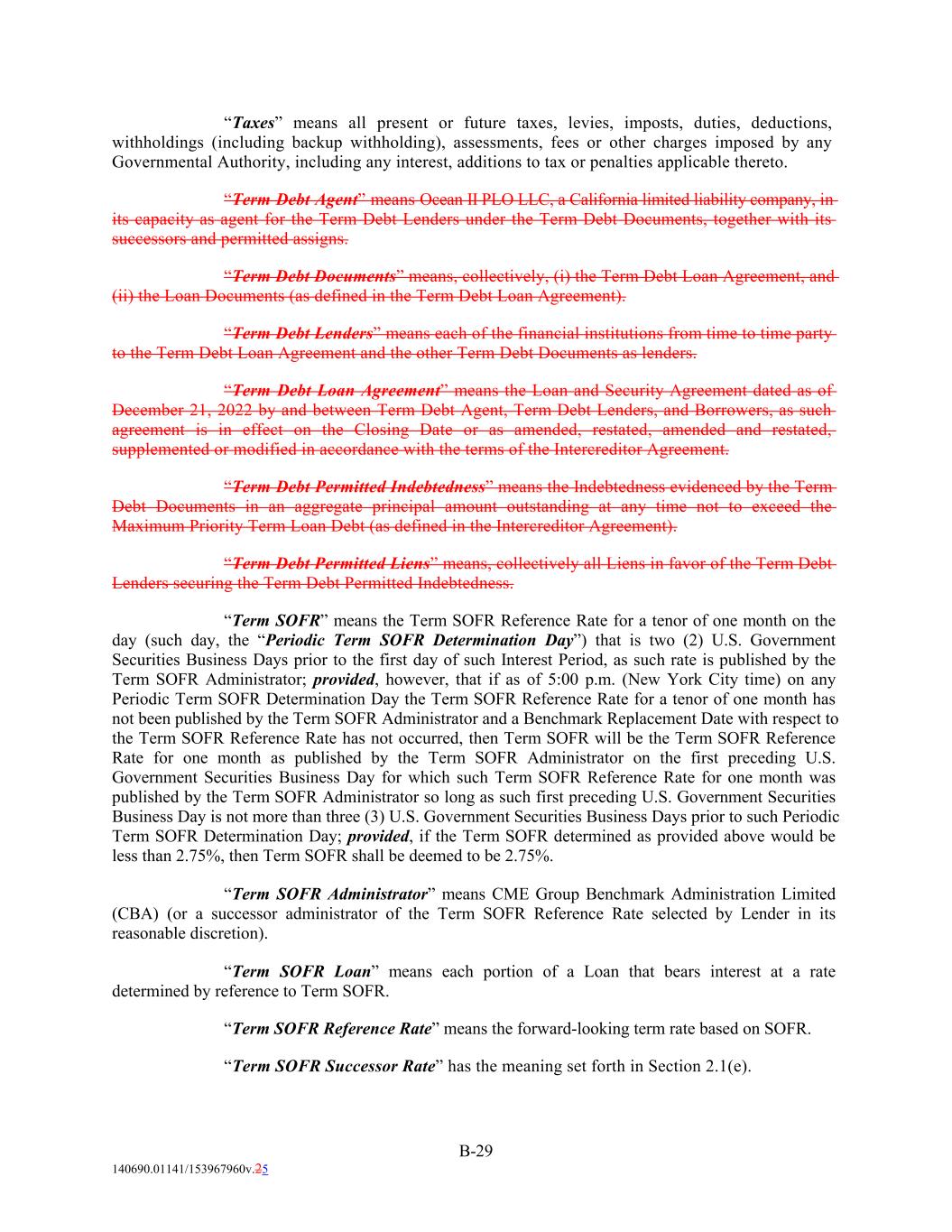 “Taxes” means all present or future taxes, levies, imposts, duties, deductions, withholdings (including backup withholding), assessments, fees or other charges imposed by any Governmental Authority, including any interest, additions to tax or penalties applicable thereto. “Term Debt Agent” means Ocean II PLO LLC, a California limited liability company, in its capacity as agent for the Term Debt Lenders under the Term Debt Documents, together with its successors and permitted assigns. “Term Debt Documents” means, collectively, (i) the Term Debt Loan Agreement, and (ii) the Loan Documents (as defined in the Term Debt Loan Agreement). “Term Debt Lenders” means each of the financial institutions from time to time party to the Term Debt Loan Agreement and the other Term Debt Documents as lenders. “Term Debt Loan Agreement” means the Loan and Security Agreement dated as of December 21, 2022 by and between Term Debt Agent, Term Debt Lenders, and Borrowers, as such agreement is in effect on the Closing Date or as amended, restated, amended and restated, supplemented or modified in accordance with the terms of the Intercreditor Agreement. “Term Debt Permitted Indebtedness” means the Indebtedness evidenced by the Term Debt Documents in an aggregate principal amount outstanding at any time not to exceed the Maximum Priority Term Loan Debt (as defined in the Intercreditor Agreement). “Term Debt Permitted Liens” means, collectively all Liens in favor of the Term Debt Lenders securing the Term Debt Permitted Indebtedness. “Term SOFR” means the Term SOFR Reference Rate for a tenor of one month on the day (such day, the “Periodic Term SOFR Determination Day”) that is two (2) U.S. Government Securities Business Days prior to the first day of such Interest Period, as such rate is published by the Term SOFR Administrator; provided, however, that if as of 5:00 p.m. (New York City time) on any Periodic Term SOFR Determination Day the Term SOFR Reference Rate for a tenor of one month has not been published by the Term SOFR Administrator and a Benchmark Replacement Date with respect to the Term SOFR Reference Rate has not occurred, then Term SOFR will be the Term SOFR Reference Rate for one month as published by the Term SOFR Administrator on the first preceding U.S. Government Securities Business Day for which such Term SOFR Reference Rate for one month was published by the Term SOFR Administrator so long as such first preceding U.S. Government Securities Business Day is not more than three (3) U.S. Government Securities Business Days prior to such Periodic Term SOFR Determination Day; provided, if the Term SOFR determined as provided above would be less than 2.75%, then Term SOFR shall be deemed to be 2.75%. “Term SOFR Administrator” means CME Group Benchmark Administration Limited (CBA) (or a successor administrator of the Term SOFR Reference Rate selected by Lender in its reasonable discretion). “Term SOFR Loan” means each portion of a Loan that bears interest at a rate determined by reference to Term SOFR. “Term SOFR Reference Rate” means the forward-looking term rate based on SOFR. “Term SOFR Successor Rate” has the meaning set forth in Section 2.1(e). B-29 140690.01141/153967960v.25