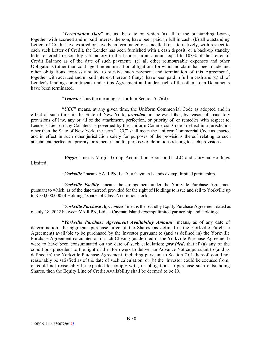 “Termination Date” means the date on which (a) all of the outstanding Loans, together with accrued and unpaid interest thereon, have been paid in full in cash, (b) all outstanding Letters of Credit have expired or have been terminated or cancelled (or alternatively, with respect to each such Letter of Credit, the Lender has been furnished with a cash deposit, or a back-up standby letter of credit reasonably satisfactory to the Lender, in an amount equal to 103% of the Letter of Credit Balance as of the date of such payment), (c) all other reimbursable expenses and other Obligations (other than contingent indemnification obligations for which no claim has been made and other obligations expressly stated to survive such payment and termination of this Agreement), together with accrued and unpaid interest thereon (if any), have been paid in full in cash and (d) all of Lender’s lending commitments under this Agreement and under each of the other Loan Documents have been terminated. “Transfer” has the meaning set forth in Section 5.25(d). “UCC” means, at any given time, the Uniform Commercial Code as adopted and in effect at such time in the State of New York; provided, in the event that, by reason of mandatory provisions of law, any or all of the attachment, perfection, or priority of, or remedies with respect to, Lender’s Lien on any Collateral is governed by the Uniform Commercial Code in effect in a jurisdiction other than the State of New York, the term “UCC” shall mean the Uniform Commercial Code as enacted and in effect in such other jurisdiction solely for purposes of the provisions thereof relating to such attachment, perfection, priority, or remedies and for purposes of definitions relating to such provisions. “Virgin” means Virgin Group Acquisition Sponsor II LLC and Corvina Holdings Limited. “Yorkville” means YA II PN, LTD., a Cayman Islands exempt limited partnership. “Yorkville Facility” means the arrangement under the Yorkville Purchase Agreement pursuant to which, as of the date thereof, provided for the right of Holdings to issue and sell to Yorkville up to $100,000,000 of Holdings’ shares of Class A common stock. “Yorkville Purchase Agreement” means the Standby Equity Purchase Agreement dated as of July 18, 2022 between YA II PN, Ltd., a Cayman Islands exempt limited partnership and Holdings. “Yorkville Purchase Agreement Availability Amount” means, as of any date of determination, the aggregate purchase price of the Shares (as defined in the Yorkville Purchase Agreement) available to be purchased by the Investor pursuant to (and as defined in) the Yorkville Purchase Agreement calculated as if such Closing (as defined in the Yorkville Purchase Agreement) were to have been consummated on the date of such calculation; provided, that if (a) any of the conditions precedent to the right of the Borrowers to deliver an Advance Notice pursuant to (and as defined in) the Yorkville Purchase Agreement, including pursuant to Section 7.01 thereof, could not reasonably be satisfied as of the date of such calculation, or (b) the Investor could be excused from, or could not reasonably be expected to comply with, its obligations to purchase such outstanding Shares, then the Equity Line of Credit Availability shall be deemed to be $0. B-30 140690.01141/153967960v.25