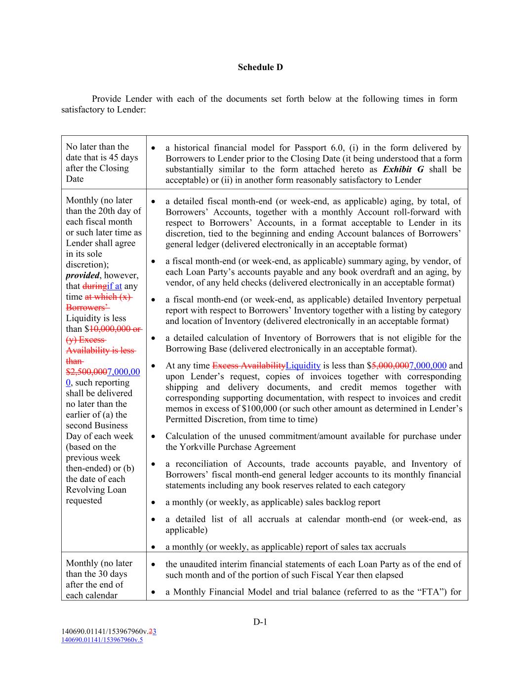 D-1 140690.01141/153967960v.23 140690.01141/153967960v.5 Monthly (no later than the 20th day of each fiscal month or such later time as Lender shall agree in its sole discretion); provided, however, that duringif at any time at which (x) Borrowers’ Liquidity is less than $10,000,000 or (y) Excess Availability is less than $2,500,0007,000,00 0, such reporting shall be delivered no later than the earlier of (a) the second Business Day of each week (based on the previous week then-ended) or (b) the date of each Revolving Loan requested  a detailed fiscal month-end (or week-end, as applicable) aging, by total, of Borrowers’ Accounts, together with a monthly Account roll-forward with respect to Borrowers’ Accounts, in a format acceptable to Lender in its discretion, tied to the beginning and ending Account balances of Borrowers’ general ledger (delivered electronically in an acceptable format)  a fiscal month-end (or week-end, as applicable) summary aging, by vendor, of each Loan Party’s accounts payable and any book overdraft and an aging, by vendor, of any held checks (delivered electronically in an acceptable format)  a fiscal month-end (or week-end, as applicable) detailed Inventory perpetual report with respect to Borrowers’ Inventory together with a listing by category and location of Inventory (delivered electronically in an acceptable format)  a detailed calculation of Inventory of Borrowers that is not eligible for the Borrowing Base (delivered electronically in an acceptable format).  At any time Excess AvailabilityLiquidity is less than $5,000,0007,000,000 and upon Lender’s request, copies of invoices together with corresponding shipping and delivery documents, and credit memos together with corresponding supporting documentation, with respect to invoices and credit memos in excess of $100,000 (or such other amount as determined in Lender’s Permitted Discretion, from time to time)  Calculation of the unused commitment/amount available for purchase under the Yorkville Purchase Agreement  a reconciliation of Accounts, trade accounts payable, and Inventory of Borrowers’ fiscal month-end general ledger accounts to its monthly financial statements including any book reserves related to each category  a monthly (or weekly, as applicable) sales backlog report  a detailed list of all accruals at calendar month-end (or week-end, as applicable)  a monthly (or weekly, as applicable) report of sales tax accruals No later than the date that is 45 days after the Closing Date Monthly (no later than the 30 days after the end of each calendar  a historical financial model for Passport 6.0, (i) in the form delivered by Borrowers to Lender prior to the Closing Date (it being understood that a form substantially similar to the form attached hereto as Exhibit G shall be acceptable) or (ii) in another form reasonably satisfactory to Lender  the unaudited interim financial statements of each Loan Party as of the end of such month and of the portion of such Fiscal Year then elapsed  a Monthly Financial Model and trial balance (referred to as the “FTA”) for Schedule D Provide Lender with each of the documents set forth below at the following times in form satisfactory to Lender: