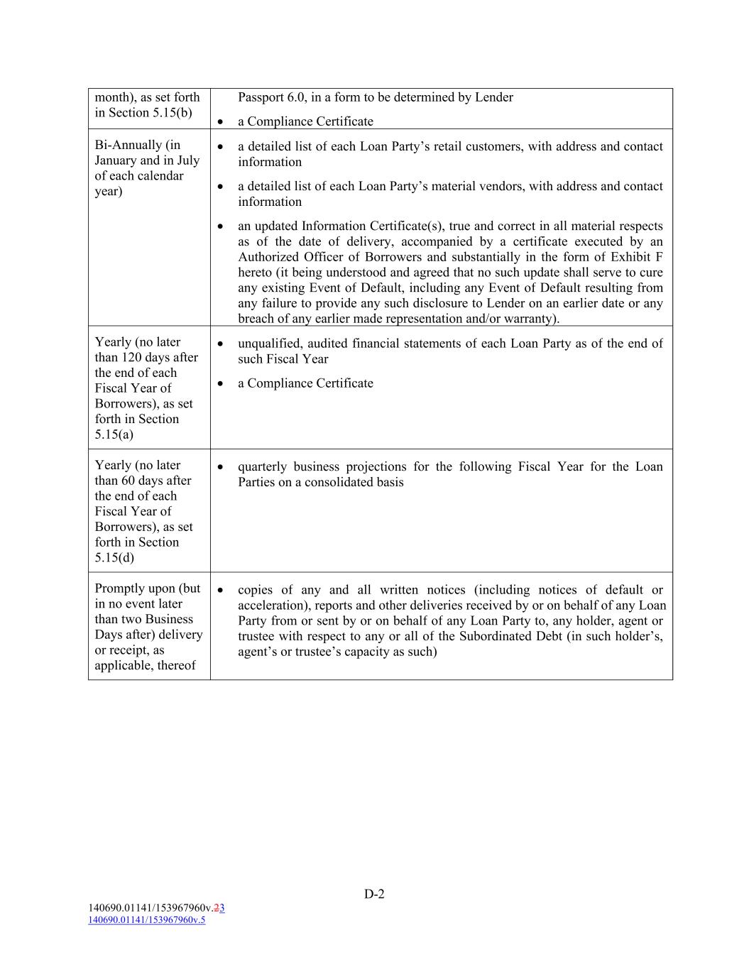 D-2 140690.01141/153967960v.23 140690.01141/153967960v.5 Yearly (no later than 120 days after the end of each Fiscal Year of Borrowers), as set forth in Section 5.15(a)  unqualified, audited financial statements of each Loan Party as of the end of such Fiscal Year  a Compliance Certificate Yearly (no later than 60 days after the end of each Fiscal Year of Borrowers), as set forth in Section 5.15(d) Bi-Annually (in January and in July of each calendar year)  quarterly business projections for the following Fiscal Year for the Loan Parties on a consolidated basis month), as set forth in Section 5.15(b)  a detailed list of each Loan Party’s retail customers, with address and contact information  a detailed list of each Loan Party’s material vendors, with address and contact information  an updated Information Certificate(s), true and correct in all material respects as of the date of delivery, accompanied by a certificate executed by an Authorized Officer of Borrowers and substantially in the form of Exhibit F hereto (it being understood and agreed that no such update shall serve to cure any existing Event of Default, including any Event of Default resulting from any failure to provide any such disclosure to Lender on an earlier date or any breach of any earlier made representation and/or warranty). Promptly upon (but in no event later than two Business Days after) delivery or receipt, as applicable, thereof  copies of any and all written notices (including notices of default or acceleration), reports and other deliveries received by or on behalf of any Loan Party from or sent by or on behalf of any Loan Party to, any holder, agent or trustee with respect to any or all of the Subordinated Debt (in such holder’s, agent’s or trustee’s capacity as such) Passport 6.0, in a form to be determined by Lender  a Compliance Certificate
