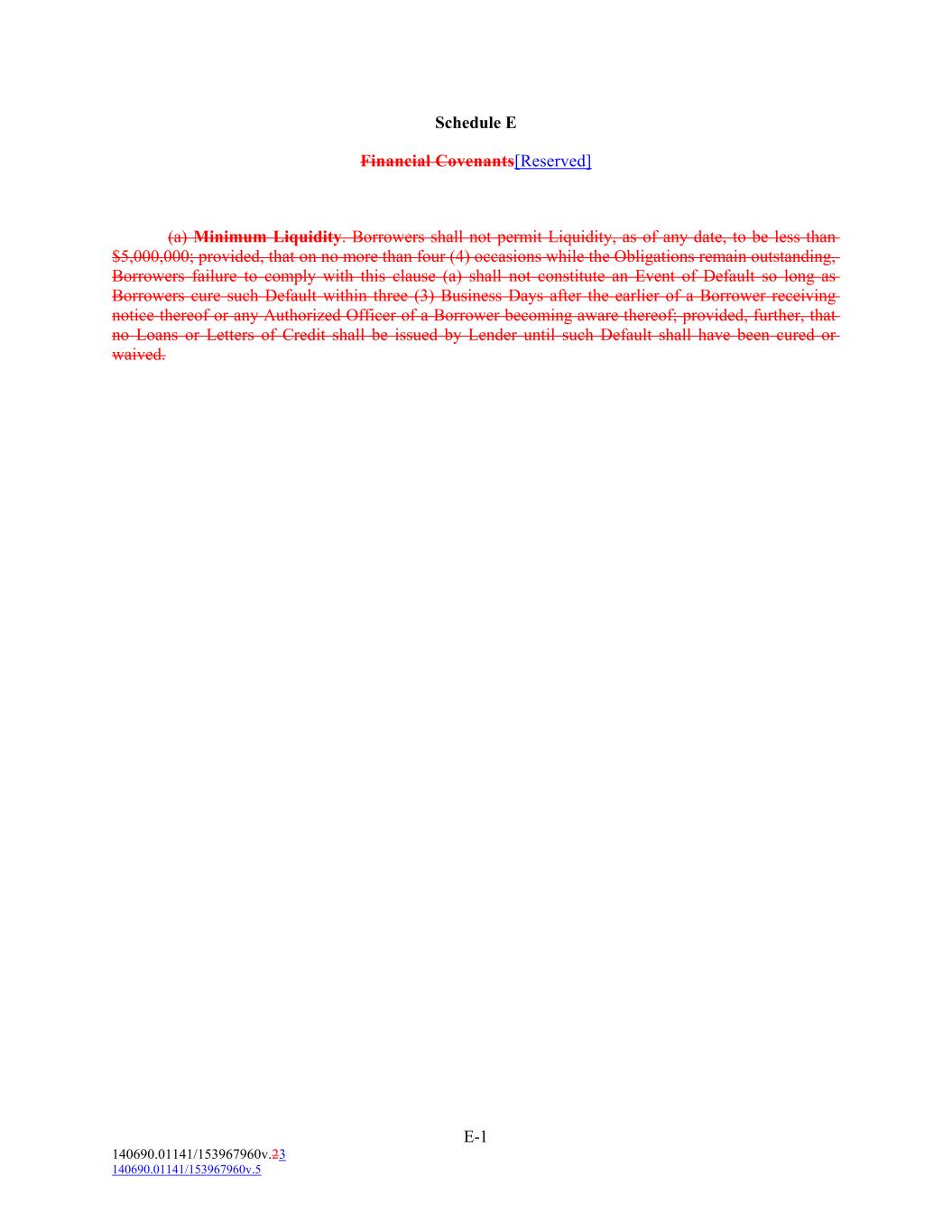 Schedule E Financial Covenants[Reserved] (a) Minimum Liquidity. Borrowers shall not permit Liquidity, as of any date, to be less than $5,000,000; provided, that on no more than four (4) occasions while the Obligations remain outstanding, Borrowers failure to comply with this clause (a) shall not constitute an Event of Default so long as Borrowers cure such Default within three (3) Business Days after the earlier of a Borrower receiving notice thereof or any Authorized Officer of a Borrower becoming aware thereof; provided, further, that no Loans or Letters of Credit shall be issued by Lender until such Default shall have been cured or waived. E-1 140690.01141/153967960v.23 140690.01141/153967960v.5