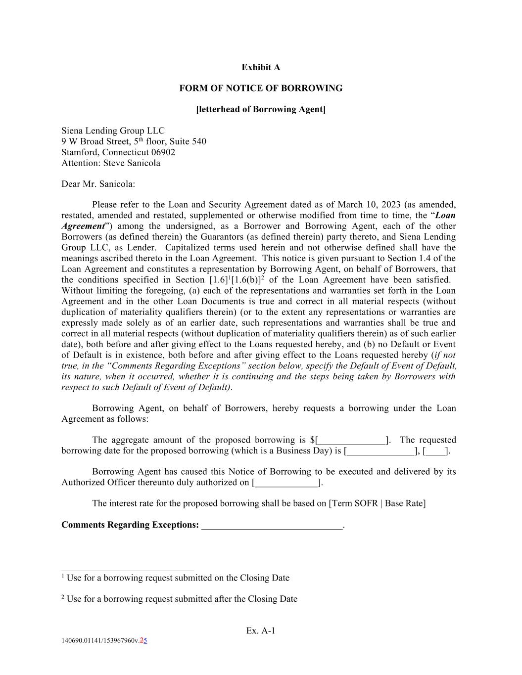 Ex. A-1 140690.01141/153967960v.25 Please refer to the Loan and Security Agreement dated as of March 10, 2023 (as amended, restated, amended and restated, supplemented or otherwise modified from time to time, the “Loan Agreement”) among the undersigned, as a Borrower and Borrowing Agent, each of the other Borrowers (as defined therein) the Guarantors (as defined therein) party thereto, and Siena Lending Group LLC, as Lender. Capitalized terms used herein and not otherwise defined shall have the meanings ascribed thereto in the Loan Agreement. This notice is given pursuant to Section 1.4 of the Loan Agreement and constitutes a representation by Borrowing Agent, on behalf of Borrowers, that the conditions specified in Section [1.6]1[1.6(b)]2 of the Loan Agreement have been satisfied. Without limiting the foregoing, (a) each of the representations and warranties set forth in the Loan Agreement and in the other Loan Documents is true and correct in all material respects (without duplication of materiality qualifiers therein) (or to the extent any representations or warranties are expressly made solely as of an earlier date, such representations and warranties shall be true and correct in all material respects (without duplication of materiality qualifiers therein) as of such earlier date), both before and after giving effect to the Loans requested hereby, and (b) no Default or Event of Default is in existence, both before and after giving effect to the Loans requested hereby (if not true, in the “Comments Regarding Exceptions” section below, specify the Default of Event of Default, its nature, when it occurred, whether it is continuing and the steps being taken by Borrowers with respect to such Default of Event of Default). Borrowing Agent, on behalf of Borrowers, hereby requests a borrowing under the Loan Agreement as follows: The aggregate amount of the proposed borrowing is $[______________]. The requested borrowing date for the proposed borrowing (which is a Business Day) is [______________], [____]. Borrowing Agent has caused this Notice of Borrowing to be executed and delivered by its Authorized Officer thereunto duly authorized on [_____________]. The interest rate for the proposed borrowing shall be based on [Term SOFR | Base Rate] Comments Regarding Exceptions: ______________________________. Exhibit A FORM OF NOTICE OF BORROWING [letterhead of Borrowing Agent] Siena Lending Group LLC 9 W Broad Street, 5th floor, Suite 540 Stamford, Connecticut 06902 Attention: Steve Sanicola Dear Mr. Sanicola: 1 Use for a borrowing request submitted on the Closing Date 2 Use for a borrowing request submitted after the Closing Date