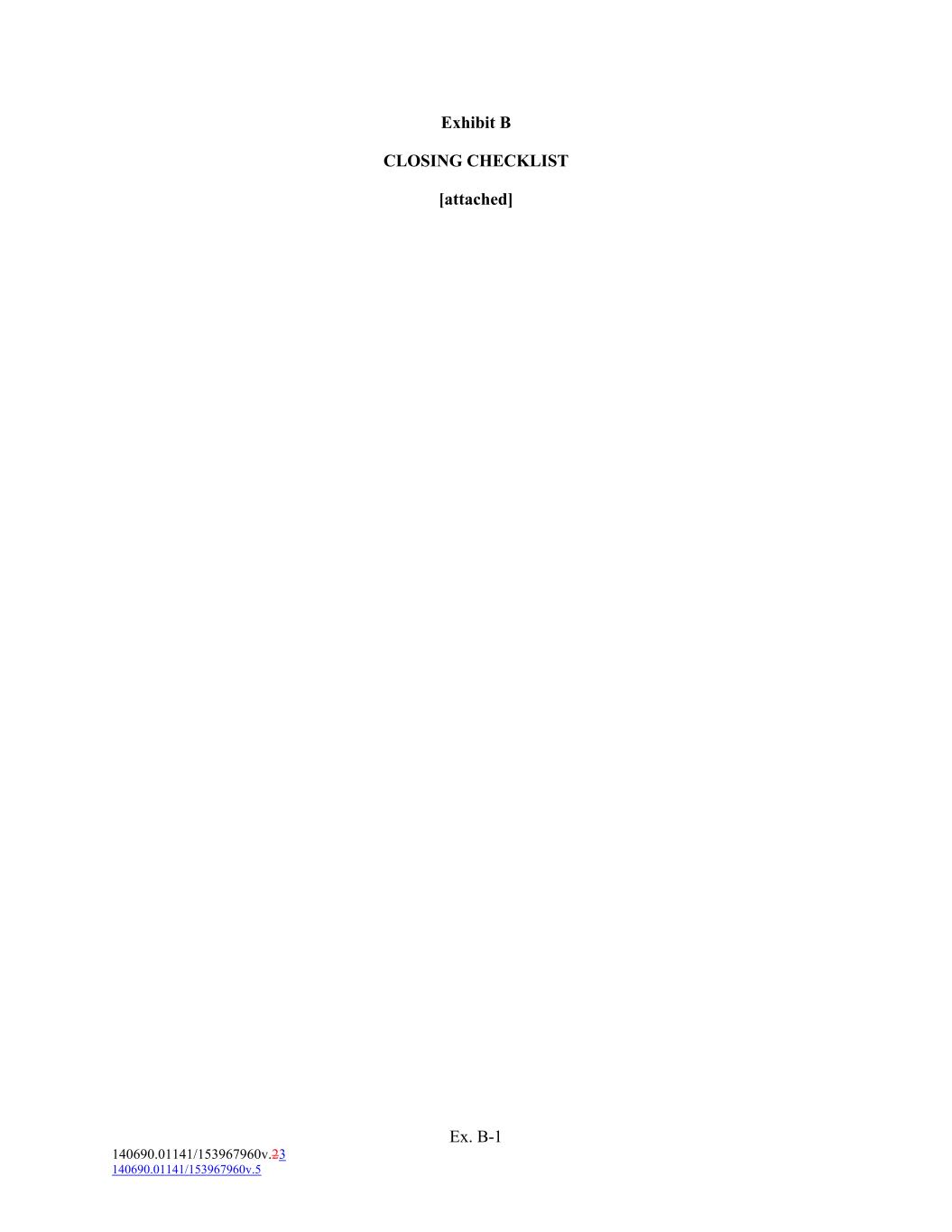 Exhibit B CLOSING CHECKLIST [attached] Ex. B-1 140690.01141/153967960v.23 140690.01141/153967960v.5