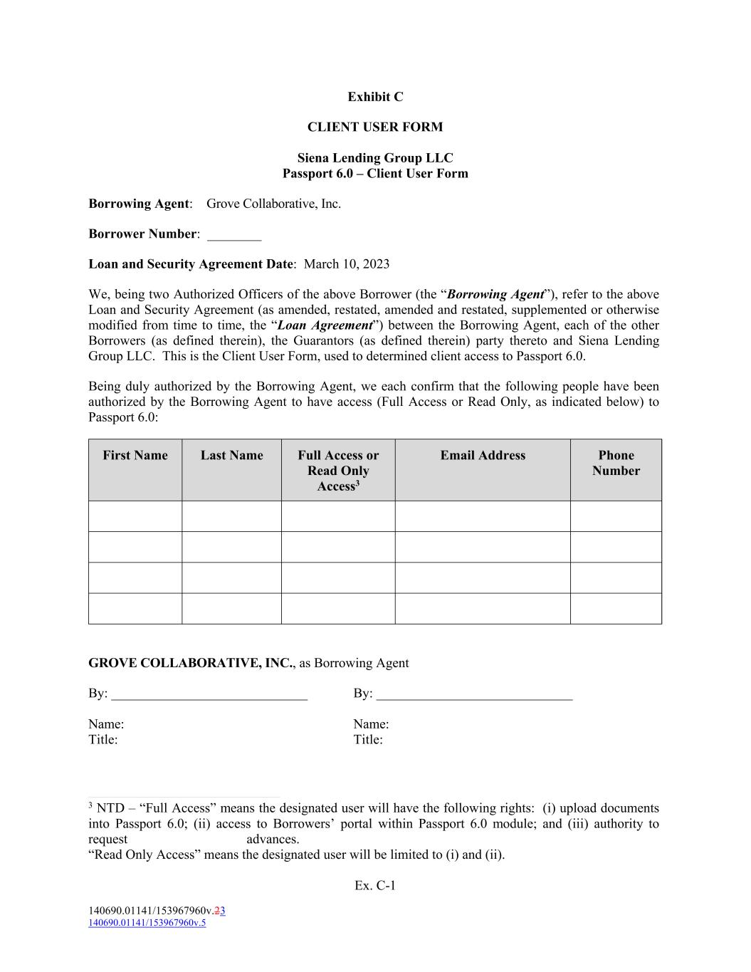 Ex. C-1 140690.01141/153967960v.23 140690.01141/153967960v.5 Phone Number First Name Last Name Exhibit C CLIENT USER FORM Siena Lending Group LLC Passport 6.0 – Client User Form Borrowing Agent: Grove Collaborative, Inc. Borrower Number: ________ Loan and Security Agreement Date: March 10, 2023 We, being two Authorized Officers of the above Borrower (the “Borrowing Agent”), refer to the above Loan and Security Agreement (as amended, restated, amended and restated, supplemented or otherwise modified from time to time, the “Loan Agreement”) between the Borrowing Agent, each of the other Borrowers (as defined therein), the Guarantors (as defined therein) party thereto and Siena Lending Group LLC. This is the Client User Form, used to determined client access to Passport 6.0. Being duly authorized by the Borrowing Agent, we each confirm that the following people have been authorized by the Borrowing Agent to have access (Full Access or Read Only, as indicated below) to Passport 6.0: Full Access or Read Only Access3 Email Address GROVE COLLABORATIVE, INC., as Borrowing Agent By: _____________________________ By: _____________________________ Name: Name: Title: Title: 3 NTD – “Full Access” means the designated user will have the following rights: (i) upload documents into Passport 6.0; (ii) access to Borrowers’ portal within Passport 6.0 module; and (iii) authority to request advances. “Read Only Access” means the designated user will be limited to (i) and (ii).