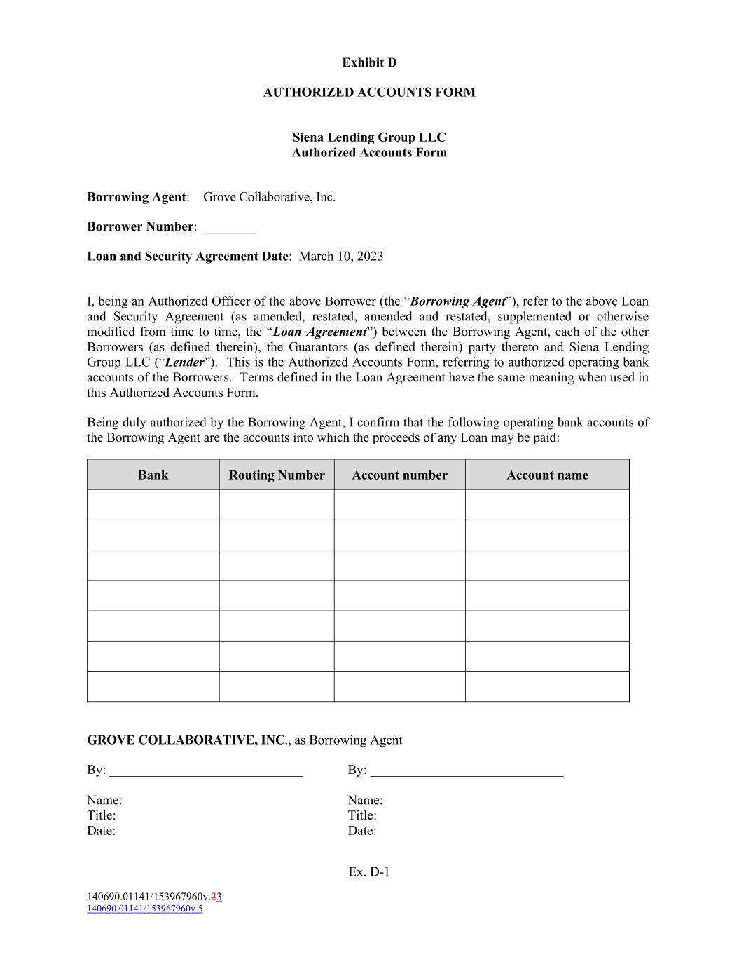 Ex. D-1 140690.01141/153967960v.23 140690.01141/153967960v.5 Exhibit D AUTHORIZED ACCOUNTS FORM Siena Lending Group LLC Authorized Accounts Form Borrowing Agent: Grove Collaborative, Inc. Borrower Number: ________ Loan and Security Agreement Date: March 10, 2023 I, being an Authorized Officer of the above Borrower (the “Borrowing Agent”), refer to the above Loan and Security Agreement (as amended, restated, amended and restated, supplemented or otherwise modified from time to time, the “Loan Agreement”) between the Borrowing Agent, each of the other Borrowers (as defined therein), the Guarantors (as defined therein) party thereto and Siena Lending Group LLC (“Lender”). This is the Authorized Accounts Form, referring to authorized operating bank accounts of the Borrowers. Terms defined in the Loan Agreement have the same meaning when used in this Authorized Accounts Form. Being duly authorized by the Borrowing Agent, I confirm that the following operating bank accounts of the Borrowing Agent are the accounts into which the proceeds of any Loan may be paid: Account number Account nameBank GROVE COLLABORATIVE, INC., as Borrowing Agent By: _____________________________ By: _____________________________ Name: Name: Title: Title: Date: Date: Routing Number