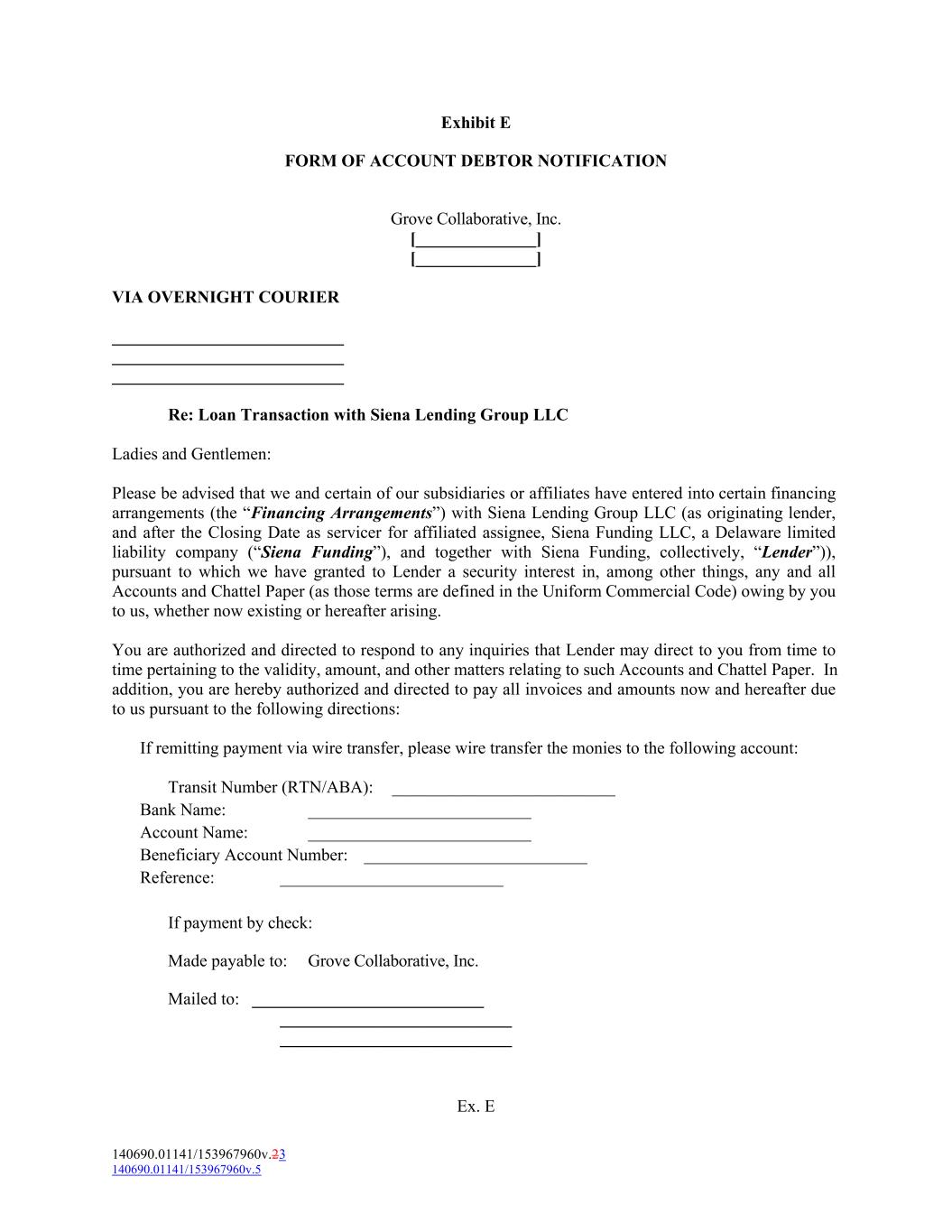 Exhibit E FORM OF ACCOUNT DEBTOR NOTIFICATION Grove Collaborative, Inc. [______________] [______________] VIA OVERNIGHT COURIER ___________________________ ___________________________ ___________________________ Re: Loan Transaction with Siena Lending Group LLC Ladies and Gentlemen: Please be advised that we and certain of our subsidiaries or affiliates have entered into certain financing arrangements (the “Financing Arrangements”) with Siena Lending Group LLC (as originating lender, and after the Closing Date as servicer for affiliated assignee, Siena Funding LLC, a Delaware limited liability company (“Siena Funding”), and together with Siena Funding, collectively, “Lender”)), pursuant to which we have granted to Lender a security interest in, among other things, any and all Accounts and Chattel Paper (as those terms are defined in the Uniform Commercial Code) owing by you to us, whether now existing or hereafter arising. You are authorized and directed to respond to any inquiries that Lender may direct to you from time to time pertaining to the validity, amount, and other matters relating to such Accounts and Chattel Paper. In addition, you are hereby authorized and directed to pay all invoices and amounts now and hereafter due to us pursuant to the following directions: If remitting payment via wire transfer, please wire transfer the monies to the following account: Transit Number (RTN/ABA): __________________________ Bank Name: __________________________ Account Name: __________________________ Beneficiary Account Number: __________________________ Reference: __________________________ If payment by check: Made payable to: Grove Collaborative, Inc. Mailed to: ___________________________ ___________________________ ___________________________ Ex. E 140690.01141/153967960v.23 140690.01141/153967960v.5
