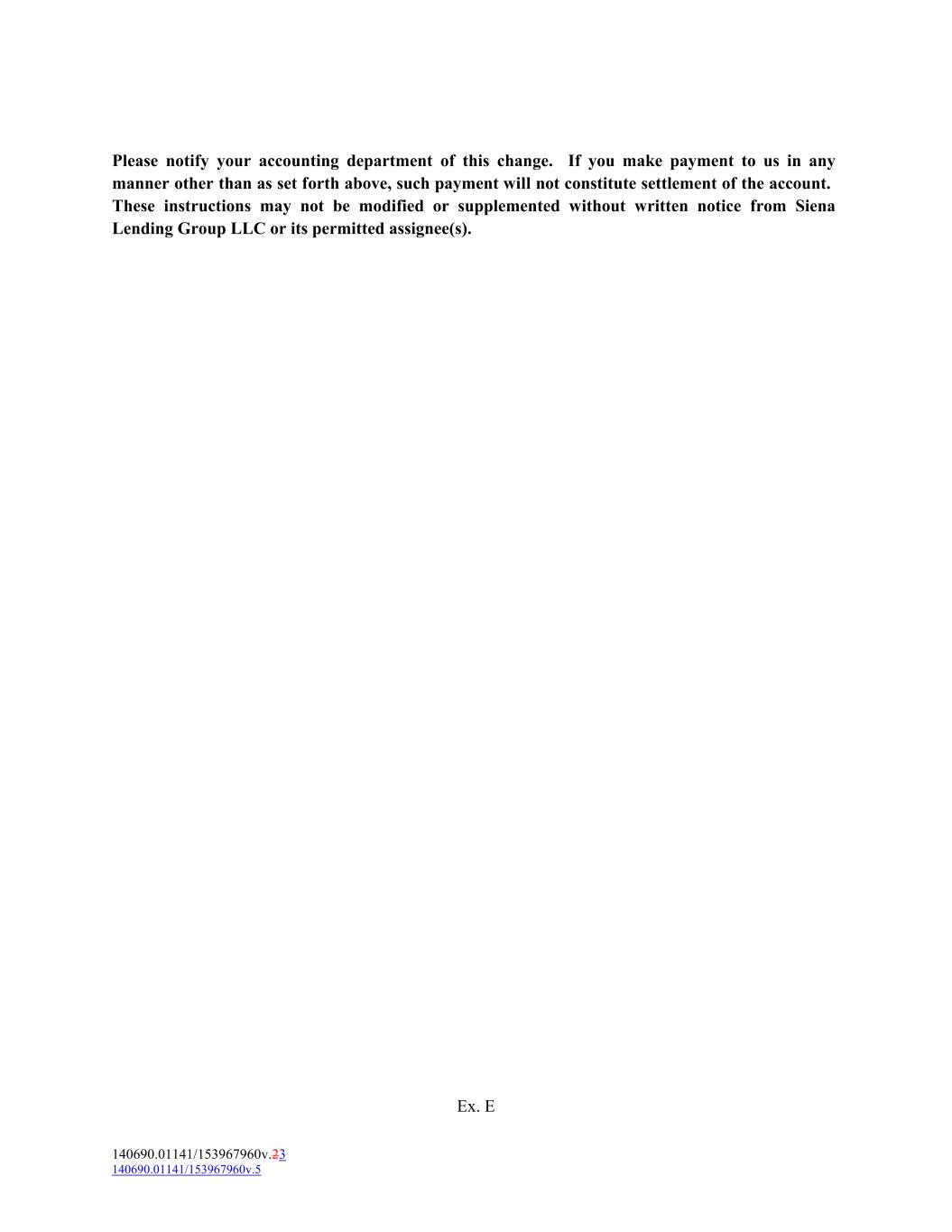 Please notify your accounting department of this change. If you make payment to us in any manner other than as set forth above, such payment will not constitute settlement of the account. These instructions may not be modified or supplemented without written notice from Siena Lending Group LLC or its permitted assignee(s). Ex. E 140690.01141/153967960v.23 140690.01141/153967960v.5