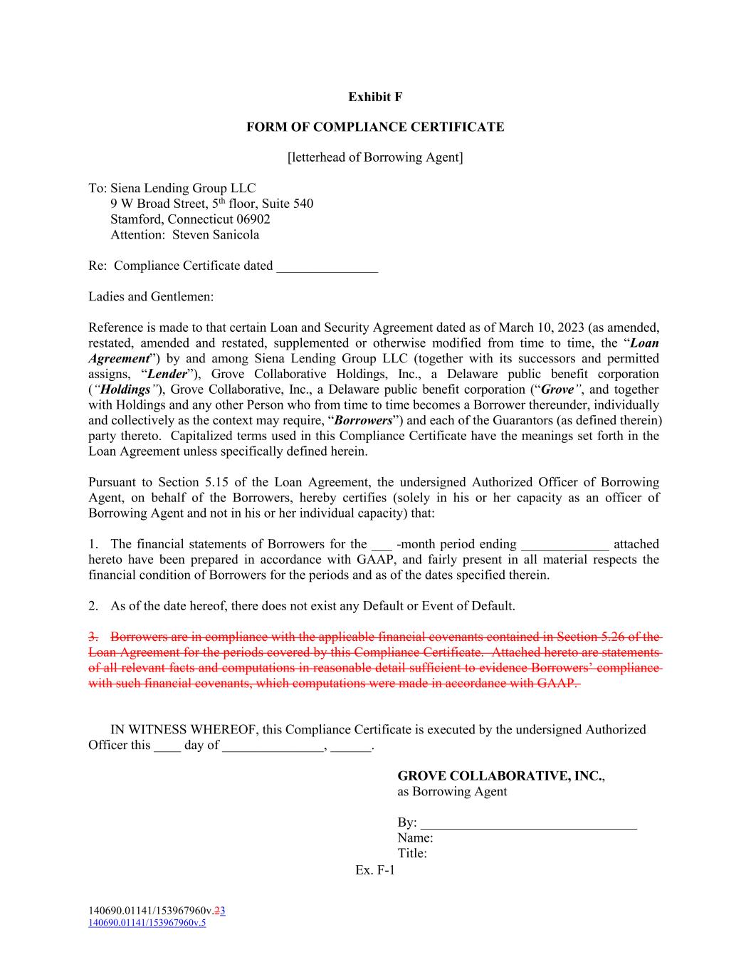 Exhibit F FORM OF COMPLIANCE CERTIFICATE [letterhead of Borrowing Agent] To: Siena Lending Group LLC 9 W Broad Street, 5th floor, Suite 540 Stamford, Connecticut 06902 Attention: Steven Sanicola Re: Compliance Certificate dated _______________ Ladies and Gentlemen: Reference is made to that certain Loan and Security Agreement dated as of March 10, 2023 (as amended, restated, amended and restated, supplemented or otherwise modified from time to time, the “Loan Agreement”) by and among Siena Lending Group LLC (together with its successors and permitted assigns, “Lender”), Grove Collaborative Holdings, Inc., a Delaware public benefit corporation (“Holdings”), Grove Collaborative, Inc., a Delaware public benefit corporation (“Grove”, and together with Holdings and any other Person who from time to time becomes a Borrower thereunder, individually and collectively as the context may require, “Borrowers”) and each of the Guarantors (as defined therein) party thereto. Capitalized terms used in this Compliance Certificate have the meanings set forth in the Loan Agreement unless specifically defined herein. Pursuant to Section 5.15 of the Loan Agreement, the undersigned Authorized Officer of Borrowing Agent, on behalf of the Borrowers, hereby certifies (solely in his or her capacity as an officer of Borrowing Agent and not in his or her individual capacity) that: 1. The financial statements of Borrowers for the ___ -month period ending _____________ attached hereto have been prepared in accordance with GAAP, and fairly present in all material respects the financial condition of Borrowers for the periods and as of the dates specified therein. 2. As of the date hereof, there does not exist any Default or Event of Default. 3. Borrowers are in compliance with the applicable financial covenants contained in Section 5.26 of the Loan Agreement for the periods covered by this Compliance Certificate. Attached hereto are statements of all relevant facts and computations in reasonable detail sufficient to evidence Borrowers’ compliance with such financial covenants, which computations were made in accordance with GAAP. IN WITNESS WHEREOF, this Compliance Certificate is executed by the undersigned Authorized Officer this ____ day of _______________, ______. GROVE COLLABORATIVE, INC., as Borrowing Agent By: ________________________________ Name: Title: Ex. F-1 140690.01141/153967960v.23 140690.01141/153967960v.5
