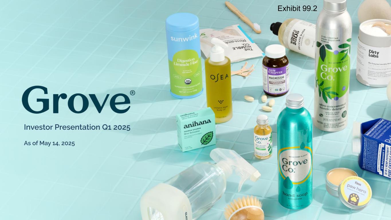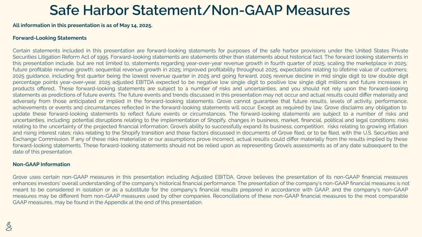 All information in this presentation is as of May 14, 2025. Forward-Looking Statements Certain statements included in this presentation are forward-looking statements for purposes of the safe harbor provisions under the United States Private Securities Litigation Reform Act of 1995. Forward-looking statements are statements other than statements about historical fact. The forward looking statements in this presentation include, but are not limited to, statements regarding year-over-year revenue growth in fourth quarter of 2025; scaling the marketplace in 2025; future profitable revenue growth; sequential revenue growth in 2025; improved profitability throughout 2025; expectations relating to lifetime value of customers; 2025 guidance, including first quarter being the lowest revenue quarter in 2025 and going forward, 2025 revenue decline in mid single digit to low double digit percentage points year-over-year, 2025 adjusted EBITDA expected to be negative low single digit to positive low single digit millions and future increases in products offered.. These forward-looking statements are subject to a number of risks and uncertainties, and you should not rely upon the forward-looking statements as predictions of future events. The future events and trends discussed in this presentation may not occur and actual results could differ materially and adversely from those anticipated or implied in the forward-looking statements. Grove cannot guarantee that future results, levels of activity, performance, achievements or events and circumstances reflected in the forward-looking statements will occur. Except as required by law, Grove disclaims any obligation to update these forward-looking statements to reflect future events or circumstances. The forward-looking statements are subject to a number of risks and uncertainties, including: potential disruptions relating to the implementation of Shopify, changes in business, market, financial, political and legal conditions; risks relating to the uncertainty of the projected financial information; Grove’s ability to successfully expand its business; competition; risks relating to growing inflation and rising interest rates; risks relating to the Shopify transition and those factors discussed in documents of Grove filed, or to be filed, with the U.S. Securities and Exchange Commission. If any of these risks materialize or our assumptions prove incorrect, actual results could differ materially from the results implied by these forward-looking statements. These forward-looking statements should not be relied upon as representing Grove’s assessments as of any date subsequent to the date of this presentation. Non-GAAP Information Grove uses certain non-GAAP measures in this presentation including Adjusted EBITDA. Grove believes the presentation of its non-GAAP financial measures enhances investors' overall understanding of the company's historical financial performance. The presentation of the company's non-GAAP financial measures is not meant to be considered in isolation or as a substitute for the company's financial results prepared in accordance with GAAP, and the company's non-GAAP measures may be different from non-GAAP measures used by other companies. Reconciliations of these non-GAAP financial measures to the most comparable GAAP measures, may be found in the Appendix at the end of this presentation. Safe Harbor Statement/Non-GAAP Measures