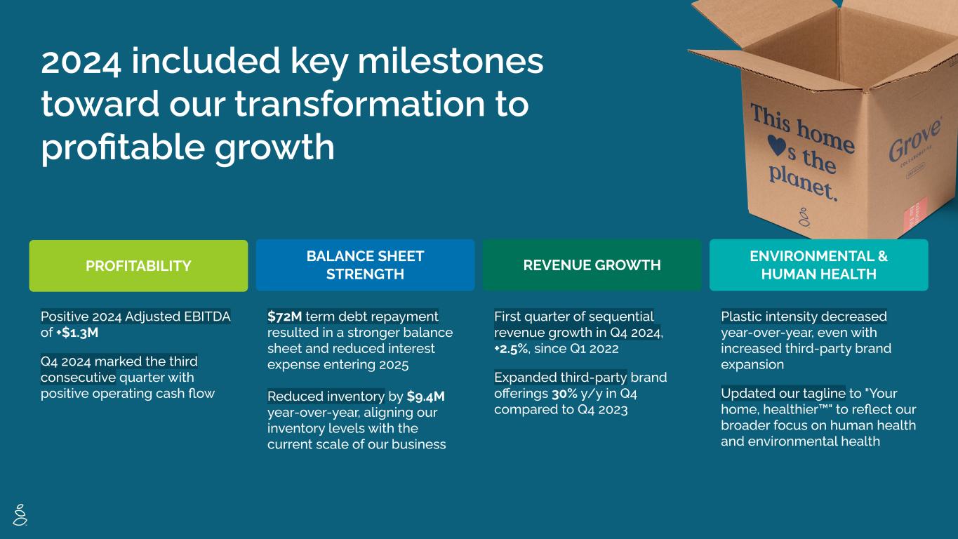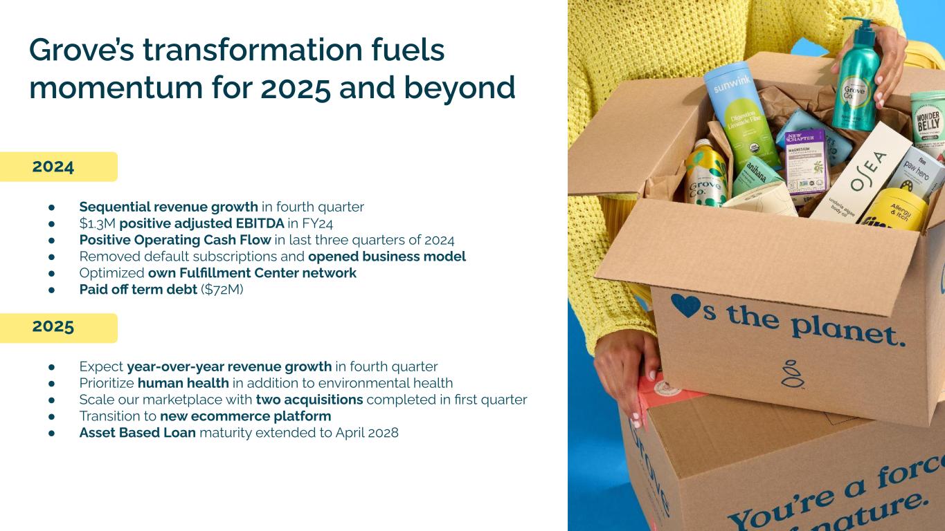 Grove’s transformation fuels momentum for 2025 and beyond 2024 ● Sequential revenue growth in fourth quarter ● $1.3M positive adjusted EBITDA in FY24 ● Positive Operating Cash Flow in last three quarters of 2024 ● Removed default subscriptions and opened business model ● Optimized own Fulfillment Center network ● Paid off term debt ($72M) 2025 ● Expect year-over-year revenue growth in fourth quarter ● Prioritize human health in addition to environmental health ● Scale our marketplace with two acquisitions completed in first quarter ● Transition to new ecommerce platform ● Asset Based Loan maturity extended to April 2028