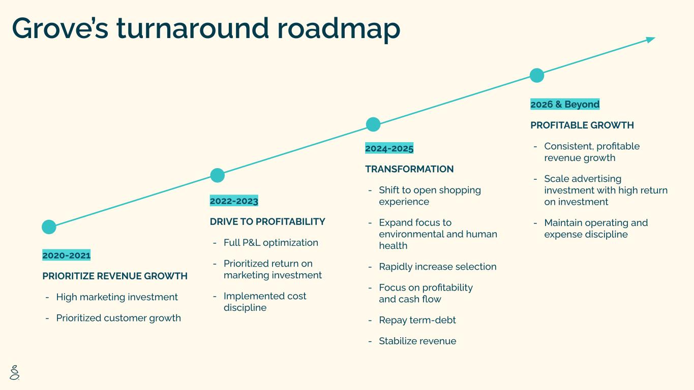 Grove’s turnaround roadmap 2020-2021 PRIORITIZE REVENUE GROWTH - High marketing investment - Prioritized customer growth 2022-2023 DRIVE TO PROFITABILITY - Full P&L optimization - Prioritized return on marketing investment - Implemented cost discipline 2024-2025 TRANSFORMATION - Shift to open shopping experience - Expand focus to environmental and human health - Rapidly increase selection - Focus on profitability and cash flow - Repay term-debt - Stabilize revenue 2026 & Beyond PROFITABLE GROWTH - Consistent, profitable revenue growth - Scale advertising investment with high return on investment - Maintain operating and expense discipline