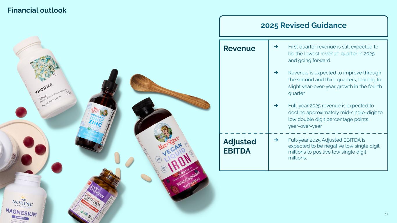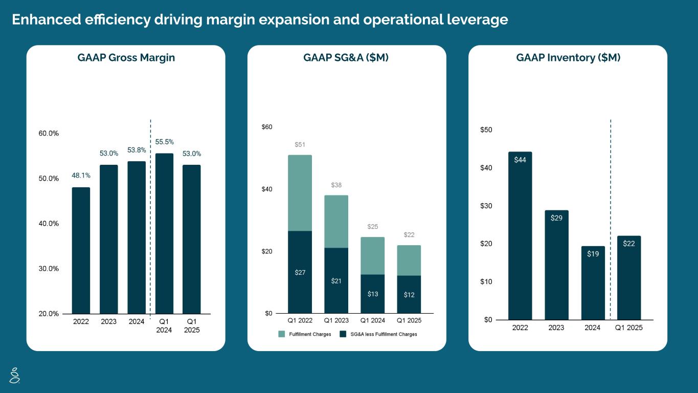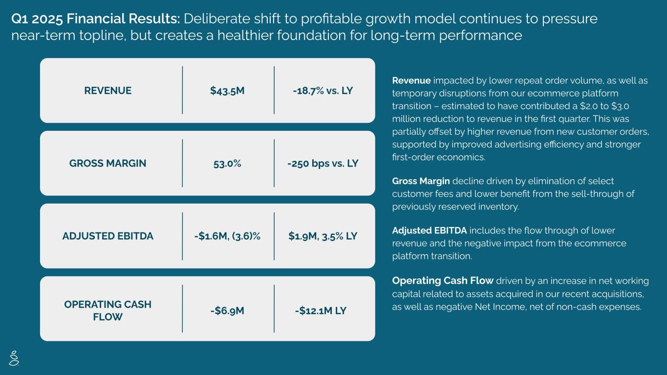 Q1 2025 Financial Results: Deliberate shift to profitable growth model continues to pressure near-term topline, but creates a healthier foundation for long-term performance ADJUSTED EBITDA GROSS MARGIN REVENUE $43.5M -18.7% vs. LY 53.0% -250 bps vs. LY -$1.6M, (3.6)% $1.9M, 3.5% LY -$6.9M -$12.1M LY Revenue impacted by lower repeat order volume, as well as temporary disruptions from our ecommerce platform transition – estimated to have contributed a $2.0 to $3.0 million reduction to revenue in the first quarter. This was partially offset by higher revenue from new customer orders, supported by improved advertising efficiency and stronger first-order economics. Gross Margin decline driven by elimination of select customer fees and lower benefit from the sell-through of previously reserved inventory. Adjusted EBITDA includes the flow through of lower revenue and the negative impact from the ecommerce platform transition. Operating Cash Flow driven by an increase in net working capital related to assets acquired in our recent acquisitions, as well as negative Net Income, net of non-cash expenses.OPERATING CASH FLOW