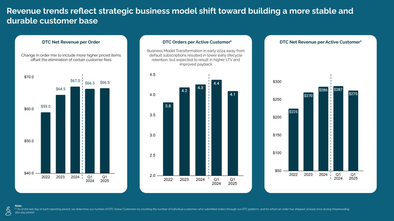 Revenue trends reflect strategic business model shift toward building a more stable and durable customer base Note: (1) As of the last day of each reporting period, we determine our number of DTC Active Customers by counting the number of individual customers who submitted orders through our DTC platform, and for whom an order has shipped, at least once during the preceding 364-day period. DTC Net Revenue per Order DTC Orders per Active Customer1 DTC Net Revenue per Active Customer1 Change in order mix to include more higher priced items offset the elimination of certain customer fees Business Model Transformation in early 2024 away from default subscriptions resulted in lower early lifecycle retention, but expected to result in higher LTV and improved payback