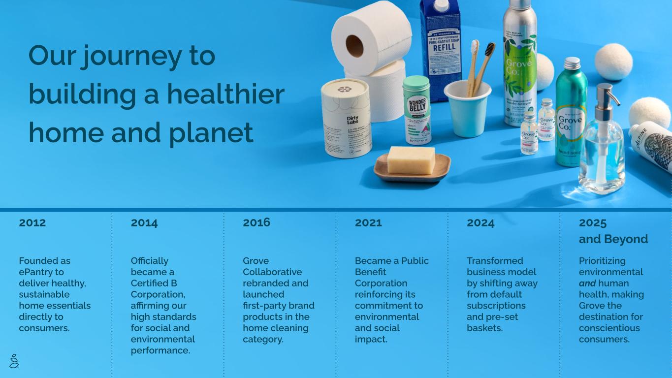Our journey to building a healthier home and planet Transformed business model by shifting away from default subscriptions and pre-set baskets. 2024 Became a Public Benefit Corporation reinforcing its commitment to environmental and social impact. 2021 Officially became a Certified B Corporation, affirming our high standards for social and environmental performance. 2014 Founded as ePantry to deliver healthy, sustainable home essentials directly to consumers. 2012 Prioritizing environmental and human health, making Grove the destination for conscientious consumers. 2025 and Beyond Grove Collaborative rebranded and launched first-party brand products in the home cleaning category. 2016