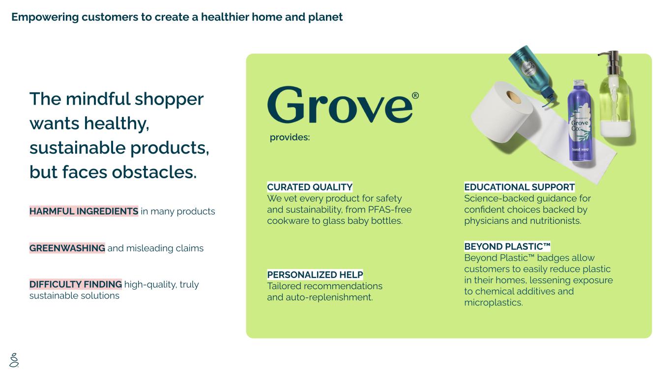 Grove Collaborative: The leading platform for conscientious consumers A differentiated alternative to Amazon and mass retailers. Helping consumers reduce exposure to chemical additives and microplastics. Every product meets rigorous standards for health, sustainability, and performance. Leading the way Beyond Plastic™A higher standard Vetted essentials for a healthier home, body, and planet