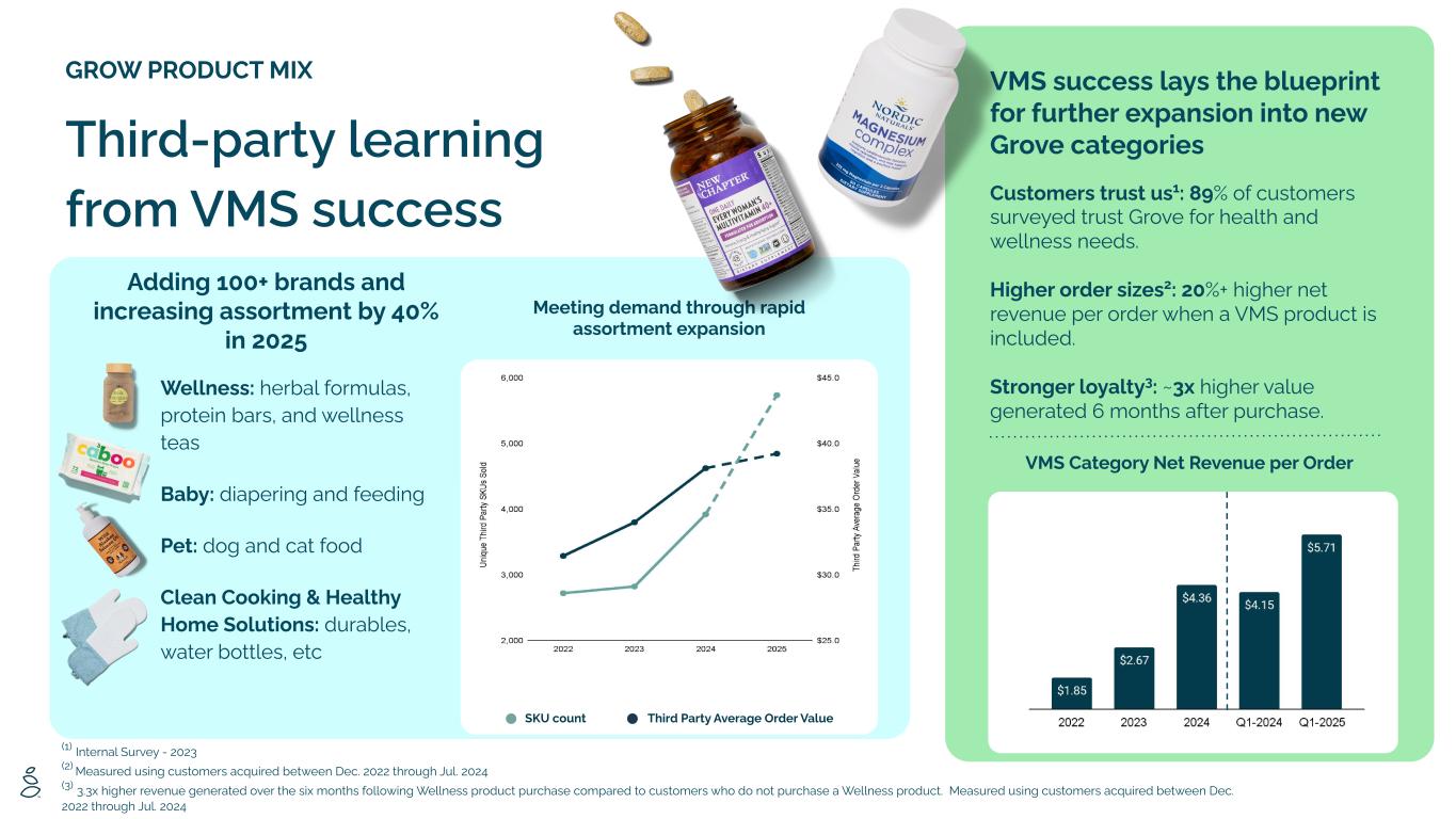 GROW PRODUCT MIX Third-party learning from VMS success VMS success lays the blueprint for further expansion into new Grove categories Customers trust us1: 89% of customers surveyed trust Grove for health and wellness needs. Higher order sizes2: 20%+ higher net revenue per order when a VMS product is included. Stronger loyalty3: ~3x higher value generated 6 months after purchase. Wellness: herbal formulas, protein bars, and wellness teas Baby: diapering and feeding Pet: dog and cat food Clean Cooking & Healthy Home Solutions: durables, water bottles, etc VMS Category Net Revenue per Order Meeting demand through rapid assortment expansion Adding 100+ brands and increasing assortment by 40% in 2025 Third Party Average Order ValueSKU count (1) Internal Survey - 2023 (2) Measured using customers acquired between Dec. 2022 through Jul. 2024 (3) 3.3x higher revenue generated over the six months following Wellness product purchase compared to customers who do not purchase a Wellness product. Measured using customers acquired between Dec. 2022 through Jul. 2024