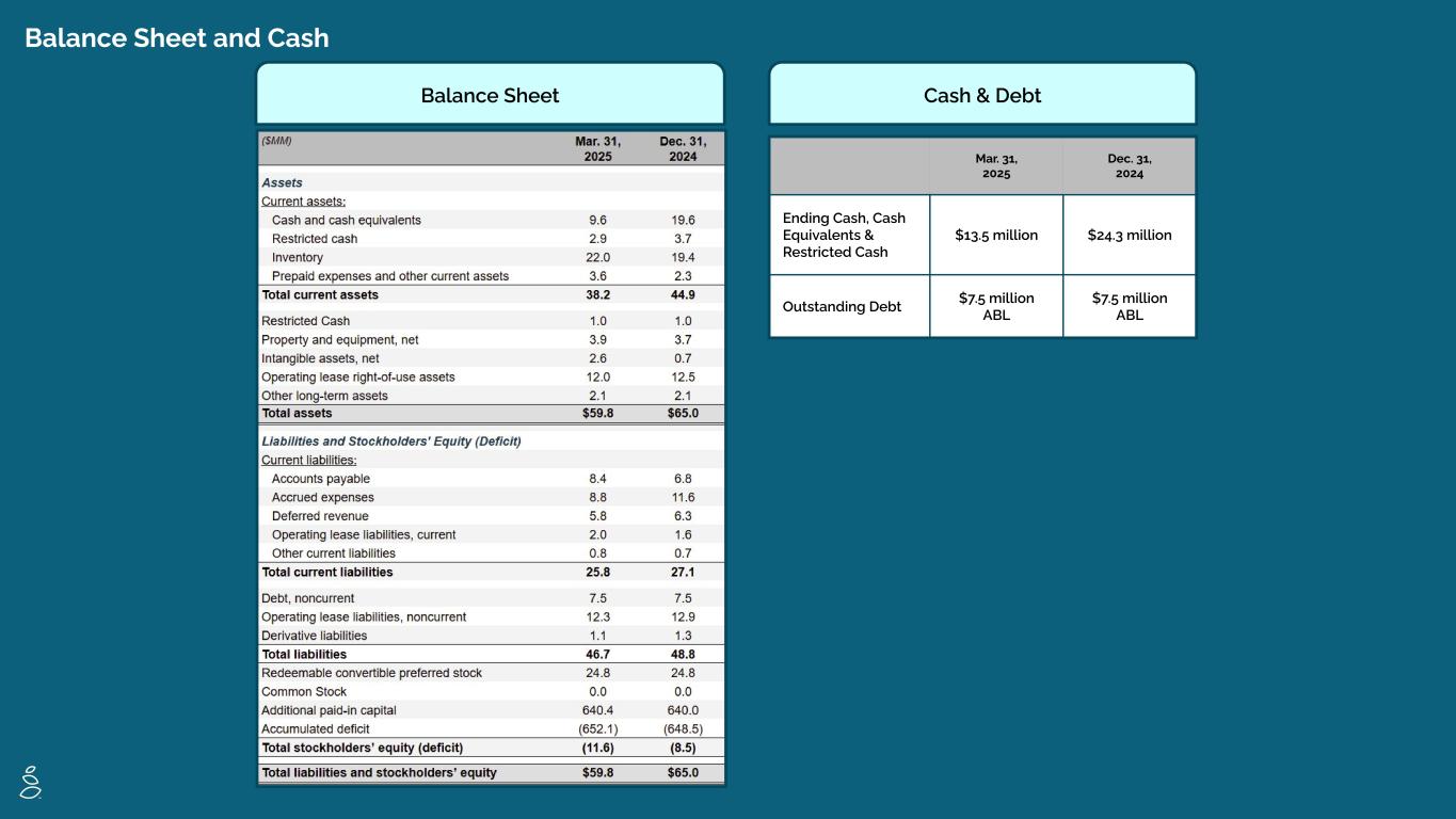 Balance Sheet and Cash Balance Sheet Mar. 31, 2025 Dec. 31, 2024 Ending Cash, Cash Equivalents & Restricted Cash $13.5 million $24.3 million Outstanding Debt $7.5 million ABL $7.5 million ABL Cash & Debt