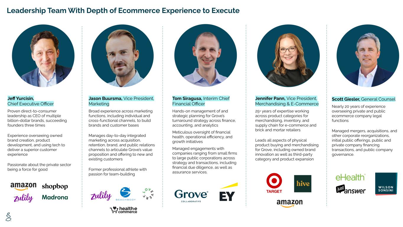 Jeff Yurcisin, Chief Executive Officer Proven direct-to-consumer leadership as CEO of multiple billion-dollar brands, succeeding founders three times Experience overseeing owned brand creation, product development, and using tech to deliver a superior customer experience Passionate about the private sector being a force for good Tom Siragusa, Interim Chief Financial Officer Hands-on management of and strategic planning for Grove’s turnaround strategy across finance, accounting, and analytics Meticulous oversight of financial health, operational efficiency, and growth initiatives Managed engagements with companies ranging from small firms to large public corporations across strategy and transactions, including financial due diligence, as well as assurance services. Jason Buursma, Vice President, Marketing Broad experience across marketing functions, including individual and cross-functional channels, to build brands and customer bases Manages day-to-day integrated marketing across acquisition, retention, brand, and public relations channels to articulate Grove’s value proposition and offering to new and existing customers Former professional athlete with passion for team-building Scott Giesler, General Counsel Nearly 20 years of experience overseeing private and public ecommerce company legal functions Managed mergers, acquisitions, and other corporate reorganizations, initial public offerings, public and private company financing transactions, and public company governance. Leadership Team With Depth of Ecommerce Experience to Execute Jennifer Pann, Vice President, Merchandising & E-Commerce 25+ years of expertise working across product categories for merchandising, inventory, and supply chain for e-commerce and brick and mortar retailers Leads all aspects of physical product buying and merchandising for Grove, including owned brand innovation as well as third-party category and product expansion