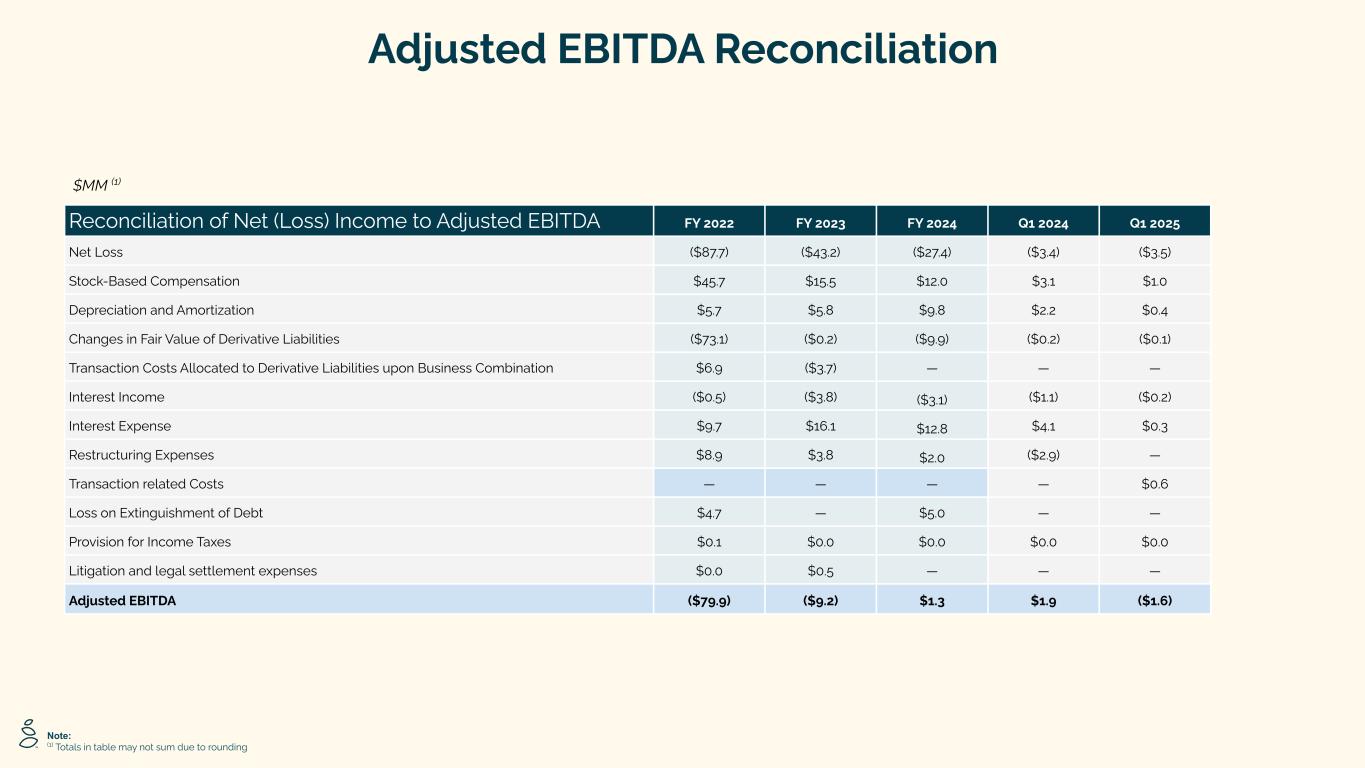 Adjusted EBITDA Reconciliation $MM (1) Note: (1) Totals in table may not sum due to rounding Reconciliation of Net (Loss) Income to Adjusted EBITDA FY 2022 FY 2023 FY 2024 Q1 2024 Q1 2025 Net Loss ($87.7) ($43.2) ($27.4) ($3.4) ($3.5) Stock-Based Compensation $45.7 $15.5 $12.0 $3.1 $1.0 Depreciation and Amortization $5.7 $5.8 $9.8 $2.2 $0.4 Changes in Fair Value of Derivative Liabilities ($73.1) ($0.2) ($9.9) ($0.2) ($0.1) Transaction Costs Allocated to Derivative Liabilities upon Business Combination $6.9 ($3.7) — — — Interest Income ($0.5) ($3.8) ($3.1) ($1.1) ($0.2) Interest Expense $9.7 $16.1 $12.8 $4.1 $0.3 Restructuring Expenses $8.9 $3.8 $2.0 ($2.9) — Transaction related Costs — — — — $0.6 Loss on Extinguishment of Debt $4.7 — $5.0 — — Provision for Income Taxes $0.1 $0.0 $0.0 $0.0 $0.0 Litigation and legal settlement expenses $0.0 $0.5 — — — Adjusted EBITDA ($79.9) ($9.2) $1.3 $1.9 ($1.6)