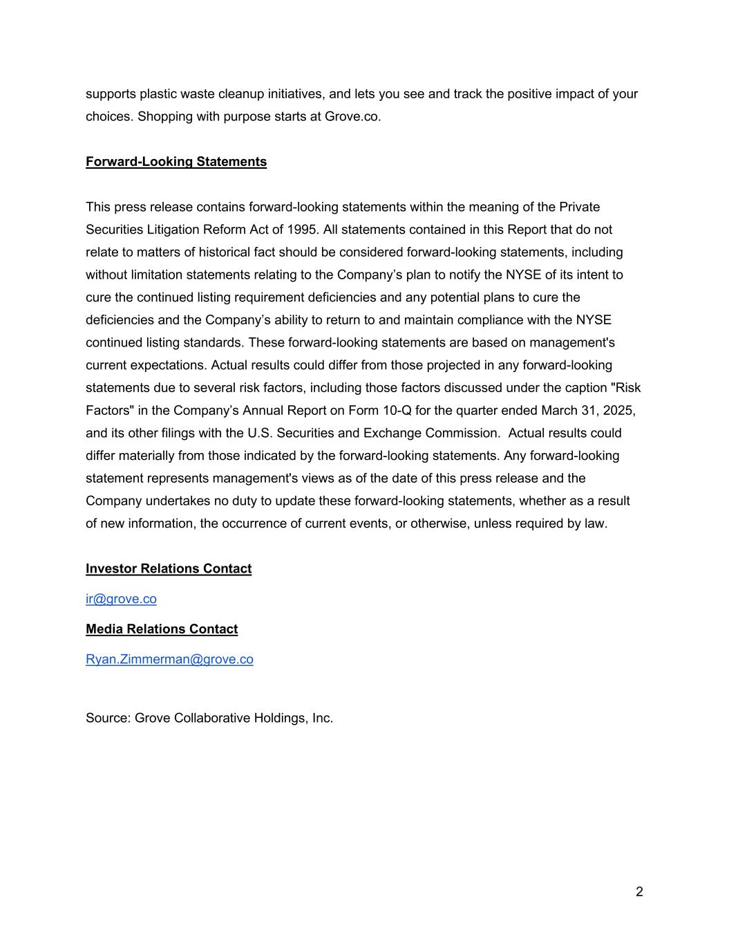 2 supports plastic waste cleanup initiatives, and lets you see and track the positive impact of your choices. Shopping with purpose starts at Grove.co. Forward-Looking Statements This press release contains forward-looking statements within the meaning of the Private Securities Litigation Reform Act of 1995. All statements contained in this Report that do not relate to matters of historical fact should be considered forward-looking statements, including without limitation statements relating to the Company’s plan to notify the NYSE of its intent to cure the continued listing requirement deficiencies and any potential plans to cure the deficiencies and the Company’s ability to return to and maintain compliance with the NYSE continued listing standards. These forward-looking statements are based on management's current expectations. Actual results could differ from those projected in any forward-looking statements due to several risk factors, including those factors discussed under the caption "Risk Factors" in the Company’s Annual Report on Form 10-Q for the quarter ended March 31, 2025, and its other filings with the U.S. Securities and Exchange Commission. Actual results could differ materially from those indicated by the forward-looking statements. Any forward-looking statement represents management's views as of the date of this press release and the Company undertakes no duty to update these forward-looking statements, whether as a result of new information, the occurrence of current events, or otherwise, unless required by law. Investor Relations Contact ir@grove.co Media Relations Contact Ryan.Zimmerman@grove.co Source: Grove Collaborative Holdings, Inc.