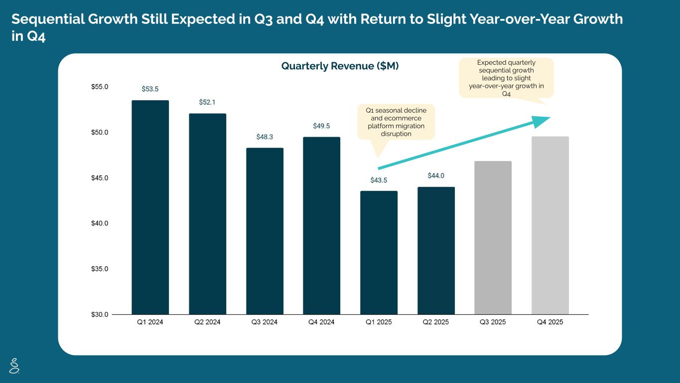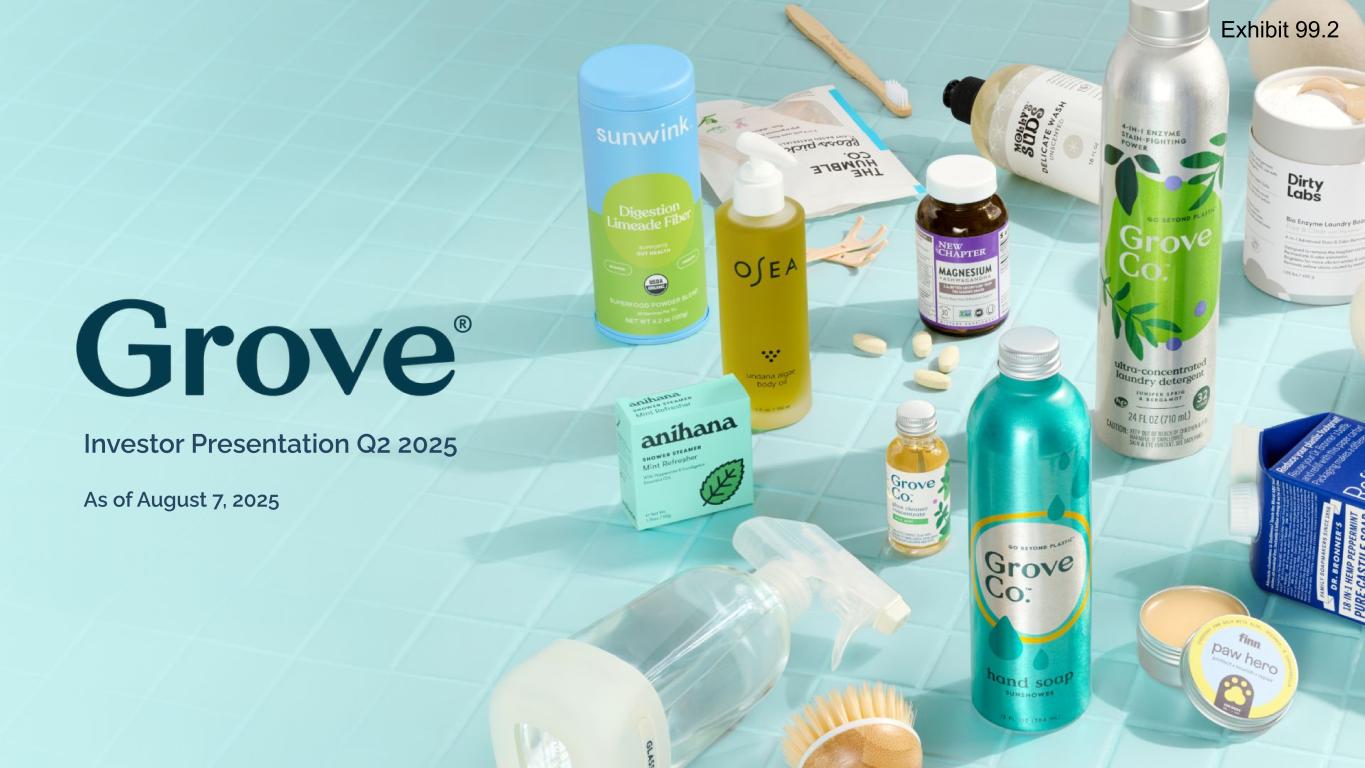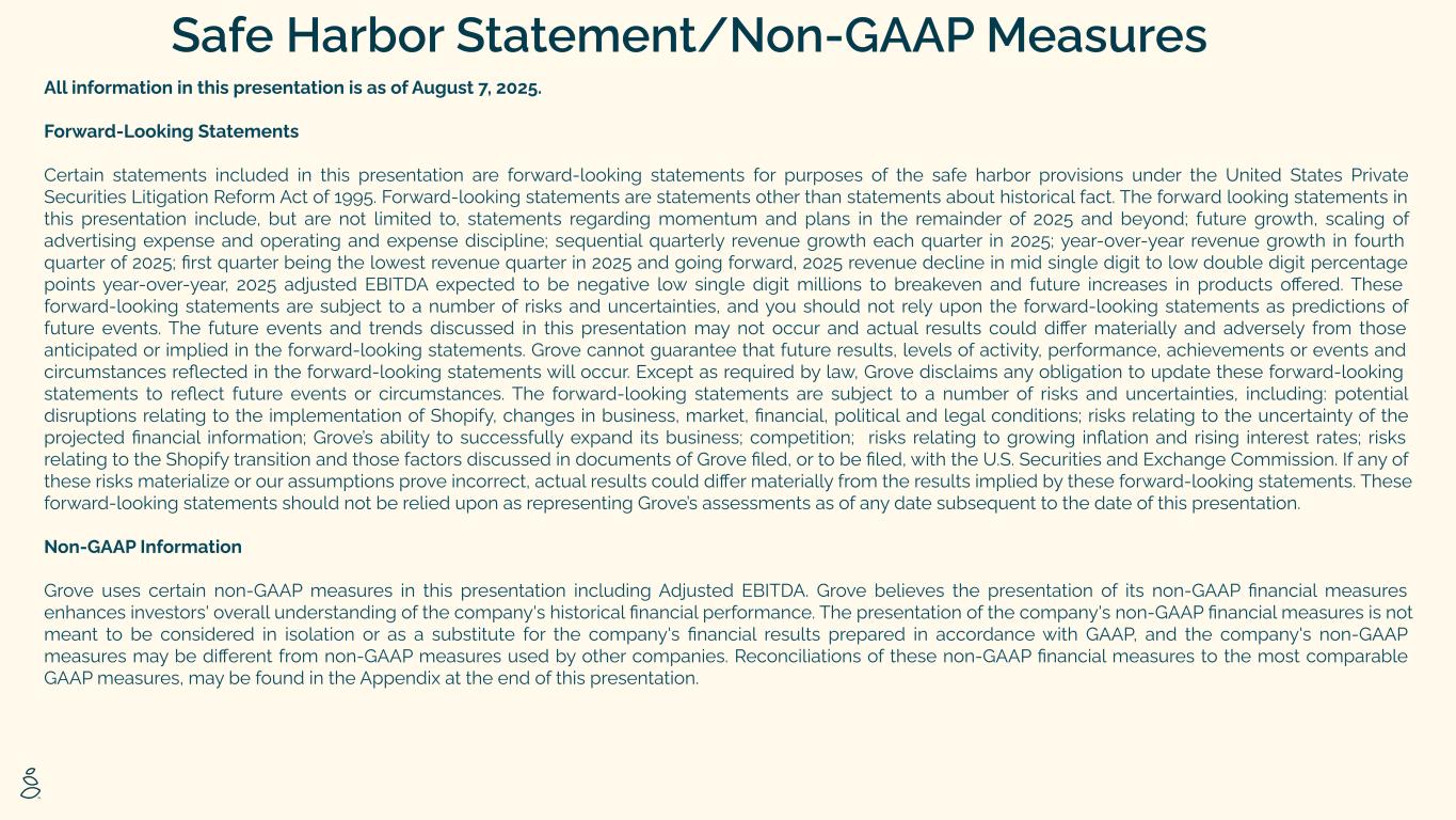 All information in this presentation is as of August 7, 2025. Forward-Looking Statements Certain statements included in this presentation are forward-looking statements for purposes of the safe harbor provisions under the United States Private Securities Litigation Reform Act of 1995. Forward-looking statements are statements other than statements about historical fact. The forward looking statements in this presentation include, but are not limited to, statements regarding momentum and plans in the remainder of 2025 and beyond; future growth, scaling of advertising expense and operating and expense discipline; sequential quarterly revenue growth each quarter in 2025; year-over-year revenue growth in fourth quarter of 2025; first quarter being the lowest revenue quarter in 2025 and going forward, 2025 revenue decline in mid single digit to low double digit percentage points year-over-year, 2025 adjusted EBITDA expected to be negative low single digit millions to breakeven and future increases in products offered. These forward-looking statements are subject to a number of risks and uncertainties, and you should not rely upon the forward-looking statements as predictions of future events. The future events and trends discussed in this presentation may not occur and actual results could differ materially and adversely from those anticipated or implied in the forward-looking statements. Grove cannot guarantee that future results, levels of activity, performance, achievements or events and circumstances reflected in the forward-looking statements will occur. Except as required by law, Grove disclaims any obligation to update these forward-looking statements to reflect future events or circumstances. The forward-looking statements are subject to a number of risks and uncertainties, including: potential disruptions relating to the implementation of Shopify, changes in business, market, financial, political and legal conditions; risks relating to the uncertainty of the projected financial information; Grove’s ability to successfully expand its business; competition; risks relating to growing inflation and rising interest rates; risks relating to the Shopify transition and those factors discussed in documents of Grove filed, or to be filed, with the U.S. Securities and Exchange Commission. If any of these risks materialize or our assumptions prove incorrect, actual results could differ materially from the results implied by these forward-looking statements. These forward-looking statements should not be relied upon as representing Grove’s assessments as of any date subsequent to the date of this presentation. Non-GAAP Information Grove uses certain non-GAAP measures in this presentation including Adjusted EBITDA. Grove believes the presentation of its non-GAAP financial measures enhances investors' overall understanding of the company's historical financial performance. The presentation of the company's non-GAAP financial measures is not meant to be considered in isolation or as a substitute for the company's financial results prepared in accordance with GAAP, and the company's non-GAAP measures may be different from non-GAAP measures used by other companies. Reconciliations of these non-GAAP financial measures to the most comparable GAAP measures, may be found in the Appendix at the end of this presentation. Safe Harbor Statement/Non-GAAP Measures