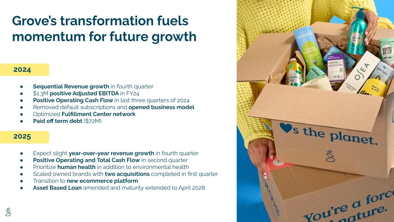 Grove’s transformation fuels momentum for future growth 2024 ● Sequential Revenue growth in fourth quarter ● $1.3M positive Adjusted EBITDA in FY24 ● Positive Operating Cash Flow in last three quarters of 2024 ● Removed default subscriptions and opened business model ● Optimized Fulfillment Center network ● Paid off term debt ($72M) 2025 ● Expect slight year-over-year revenue growth in fourth quarter ● Positive Operating and Total Cash Flow in second quarter ● Prioritize human health in addition to environmental health ● Scaled owned brands with two acquisitions completed in first quarter ● Transition to new ecommerce platform ● Asset Based Loan amended and maturity extended to April 2028