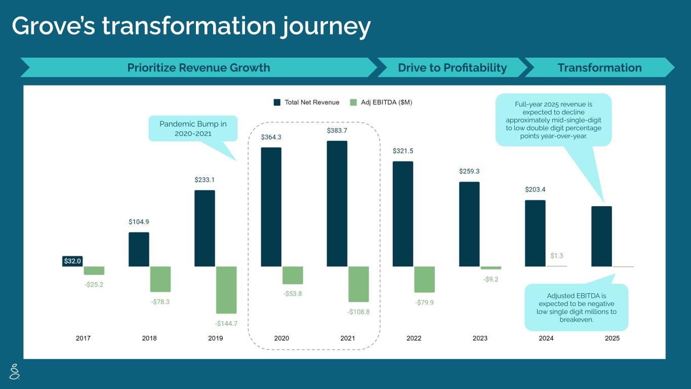Grove’s transformation journey Prioritize Revenue Growth Drive to Profitability Transformation Pandemic Bump in 2020-2021 Full-year 2025 revenue is expected to decline approximately mid-single-digit to low double digit percentage points year-over-year. Adjusted EBITDA is expected to be negative low single digit millions to breakeven.