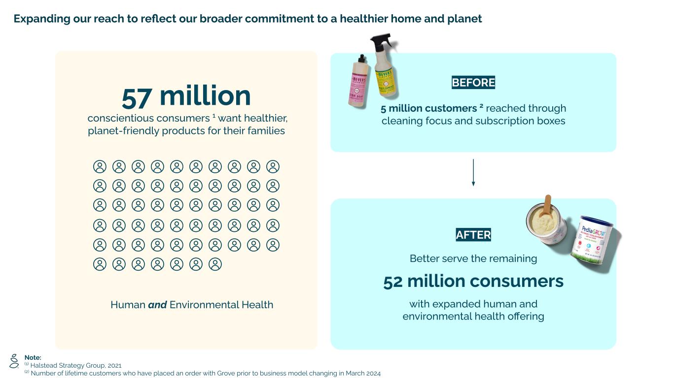 Expanding our reach to reflect our broader commitment to a healthier home and planet Human and Environmental Health BEFORE 5 million customers 2 reached through cleaning focus and subscription boxes 57 million conscientious consumers 1 want healthier, planet-friendly products for their families Note: (1) Halstead Strategy Group, 2021 (2) Number of lifetime customers who have placed an order with Grove prior to business model changing in March 2024 AFTER Better serve the remaining 52 million consumers with expanded human and environmental health offering