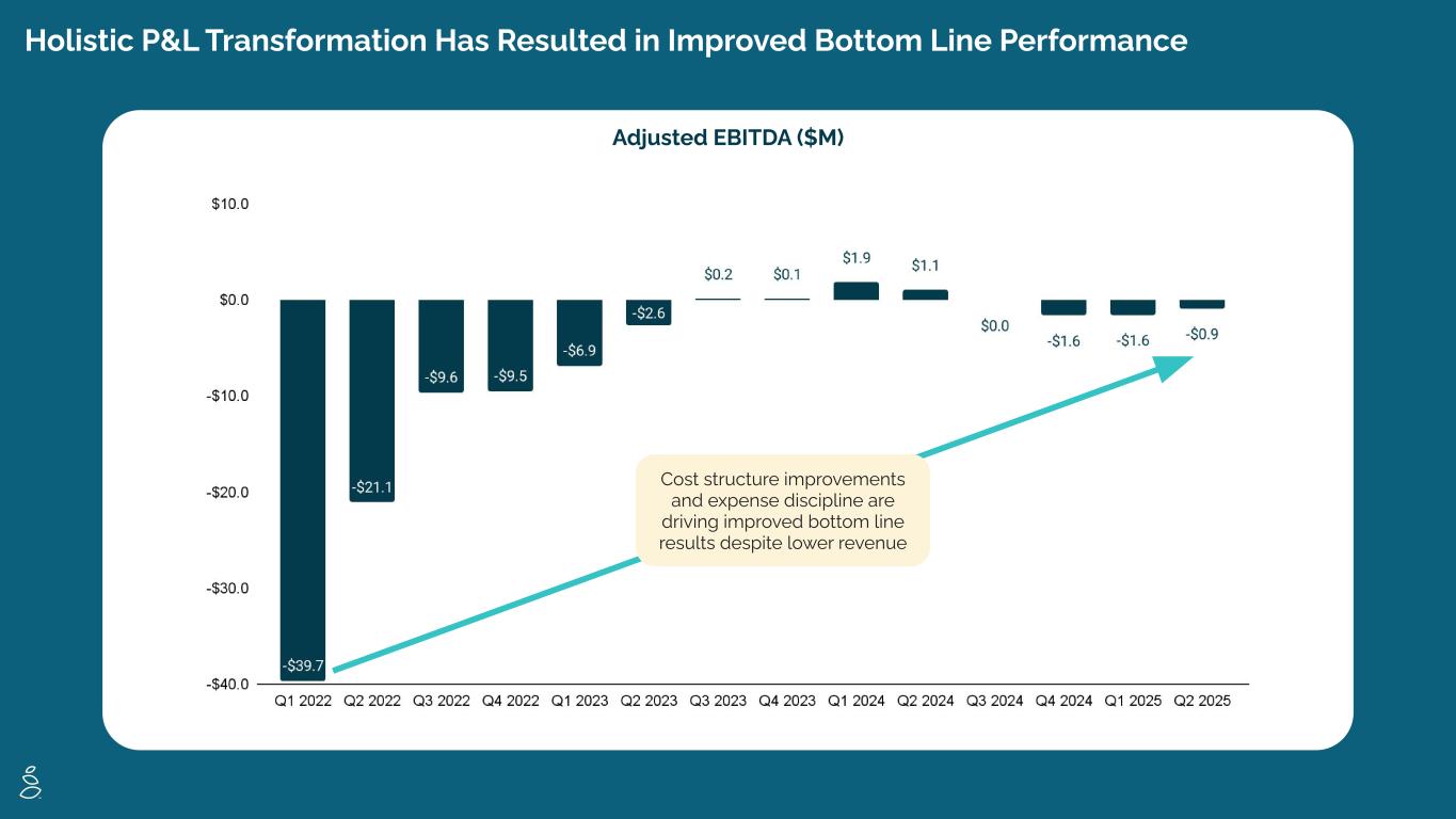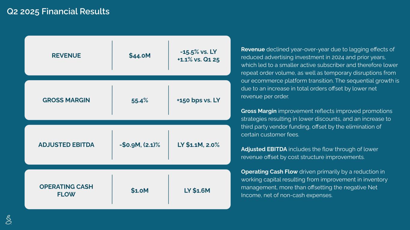 Q2 2025 Financial Results ADJUSTED EBITDA GROSS MARGIN REVENUE $44.0M -15.5% vs. LY +1.1% vs. Q1 25 55.4% +150 bps vs. LY -$0.9M, (2.1)% LY $1.1M, 2.0% $1.0M LY $1.6M Revenue declined year-over-year due to lagging effects of reduced advertising investment in 2024 and prior years, which led to a smaller active subscriber and therefore lower repeat order volume, as well as temporary disruptions from our ecommerce platform transition. The sequential growth is due to an increase in total orders offset by lower net revenue per order. Gross Margin improvement reflects improved promotions strategies resulting in lower discounts, and an increase to third party vendor funding, offset by the elimination of certain customer fees. Adjusted EBITDA includes the flow through of lower revenue offset by cost structure improvements. Operating Cash Flow driven primarily by a reduction in working capital resulting from improvement in inventory management, more than offsetting the negative Net Income, net of non-cash expenses. OPERATING CASH FLOW