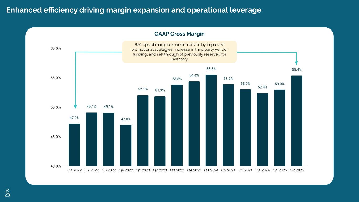Enhanced efficiency driving margin expansion and operational leverage GAAP Gross Margin 820 bps of margin expansion driven by improved promotional strategies, increase in third party vendor funding, and sell through of previously reserved for inventory.