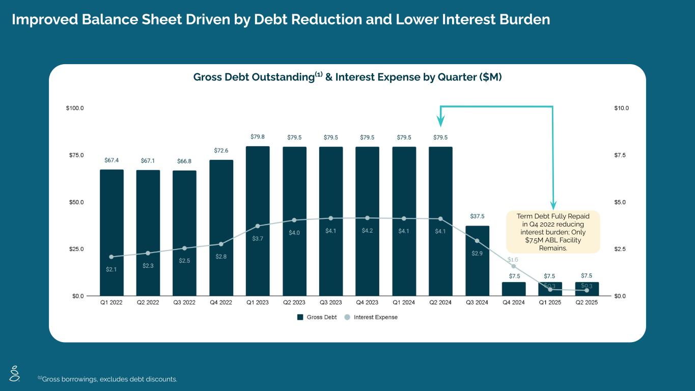 Improved Balance Sheet Driven by Debt Reduction and Lower Interest Burden Gross Debt Outstanding(1) & Interest Expense by Quarter ($M) Interest Expense Down 90% in 2025 vs. 2024 — Freeing Up Capital (1)Gross borrowings, excludes debt discounts. Term Debt Fully Repaid in Q4 2022 reducing interest burden; Only $7.5M ABL Facility Remains. $1.6 $0.3 $0.3