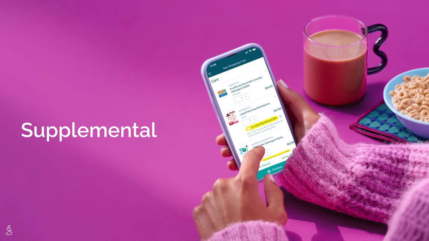 GROW PRODUCT MIX Third-party learning from VMS success VMS success lays the blueprint for further expansion into new Grove categories Customers trust us1: 89% of customers surveyed trust Grove for health and wellness needs. Higher order sizes2: 20%+ higher net revenue per order when a VMS product is included. Stronger loyalty3: ~3x higher value generated 6 months after purchase. Wellness: herbal formulas, protein bars, and wellness teas Baby: diapering and feeding Pet: dog and cat food Clean Cooking & Healthy Home Solutions: durables, water bottles, etc VMS Category Net Revenue per Order Meeting demand through rapid assortment expansion Adding 100+ brands and increasing assortment by 40% in 2025 Third Party Average Order ValueSKU count (1) Internal Survey - 2023 (2) Measured using customers acquired between Dec. 2022 through Jul. 2024 (3) 3.3x higher revenue generated over the six months following Wellness product purchase compared to customers who do not purchase a Wellness product. Measured using customers acquired between Dec. 2022 through Jul. 2024