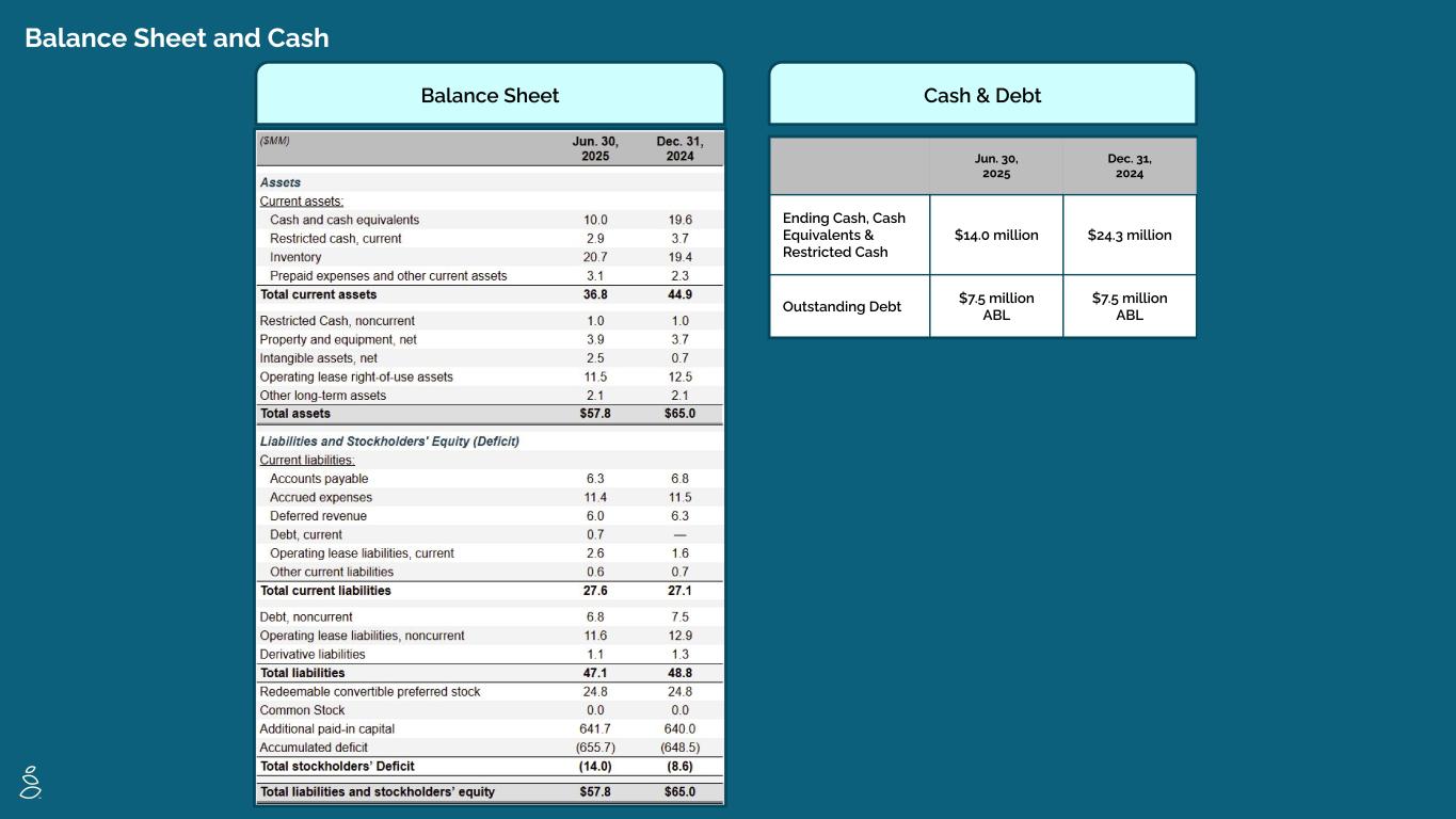 Balance Sheet and Cash Balance Sheet Jun. 30, 2025 Dec. 31, 2024 Ending Cash, Cash Equivalents & Restricted Cash $14.0 million $24.3 million Outstanding Debt $7.5 million ABL $7.5 million ABL Cash & Debt