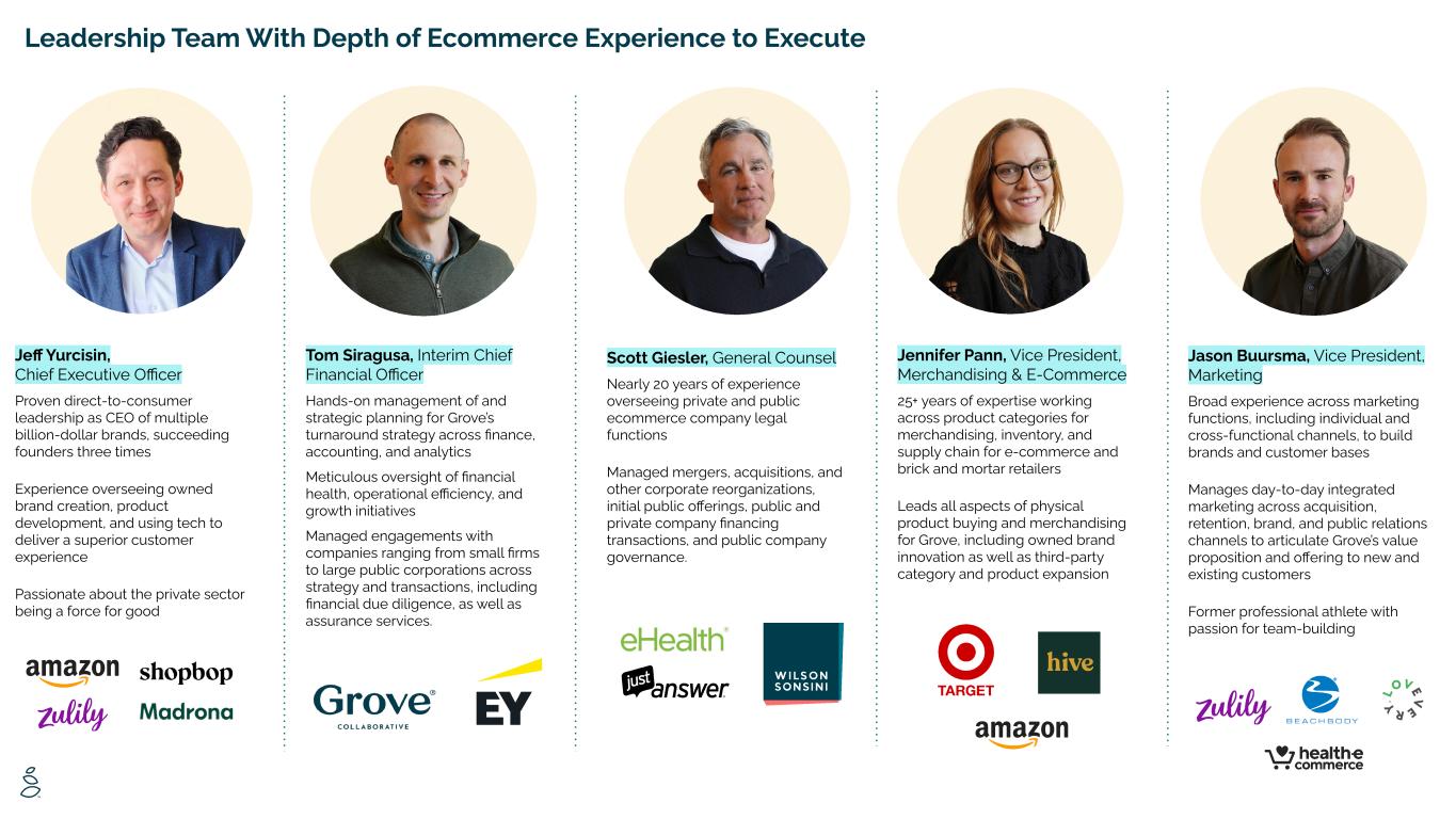 Leadership Team With Depth of Ecommerce Experience to Execute Tom Siragusa, Interim Chief Financial Officer Hands-on management of and strategic planning for Grove’s turnaround strategy across finance, accounting, and analytics Meticulous oversight of financial health, operational efficiency, and growth initiatives Managed engagements with companies ranging from small firms to large public corporations across strategy and transactions, including financial due diligence, as well as assurance services. Jennifer Pann, Vice President, Merchandising & E-Commerce 25+ years of expertise working across product categories for merchandising, inventory, and supply chain for e-commerce and brick and mortar retailers Leads all aspects of physical product buying and merchandising for Grove, including owned brand innovation as well as third-party category and product expansion Scott Giesler, General Counsel Nearly 20 years of experience overseeing private and public ecommerce company legal functions Managed mergers, acquisitions, and other corporate reorganizations, initial public offerings, public and private company financing transactions, and public company governance. Jason Buursma, Vice President, Marketing Broad experience across marketing functions, including individual and cross-functional channels, to build brands and customer bases Manages day-to-day integrated marketing across acquisition, retention, brand, and public relations channels to articulate Grove’s value proposition and offering to new and existing customers Former professional athlete with passion for team-building Jeff Yurcisin, Chief Executive Officer Proven direct-to-consumer leadership as CEO of multiple billion-dollar brands, succeeding founders three times Experience overseeing owned brand creation, product development, and using tech to deliver a superior customer experience Passionate about the private sector being a force for good