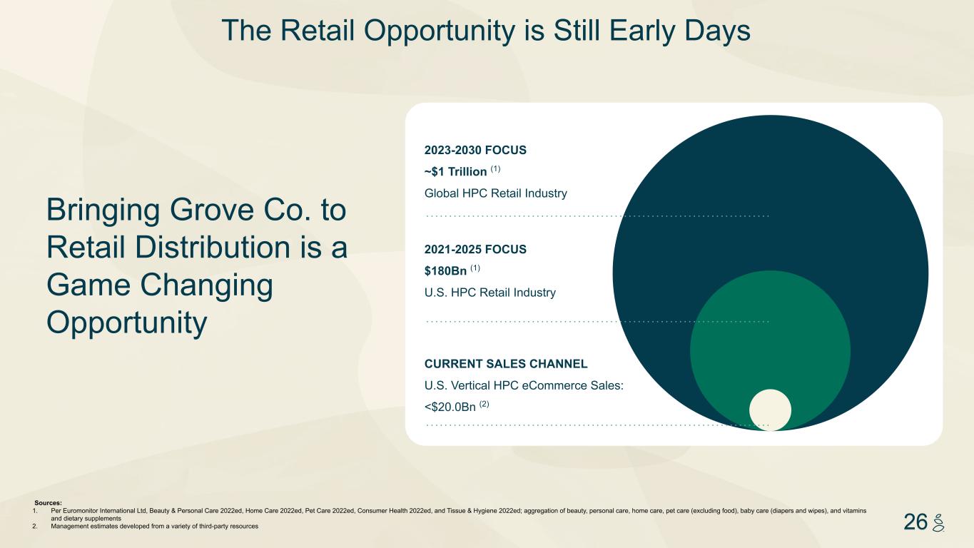 NOTES START FROM HERE AND GROW UP NO CONTENT BELOW THIS LINE CONTENT BELOW THIS LINE SUBTITLE BELOW THIS LINE TITLE CAN NOT GO ABOVE THIS LINE 3 59 76 0 114 88 120 159 144 130 186 128 102 163 157 172 196 200 255 255 255 0 0 0 247 243 228 3 59 76 247 243 228 26 Bringing Grove Co. to Retail Distribution is a Game Changing Opportunity Sources: 1. Per Euromonitor International Ltd, Beauty & Personal Care 2022ed, Home Care 2022ed, Pet Care 2022ed, Consumer Health 2022ed, and Tissue & Hygiene 2022ed; aggregation of beauty, personal care, home care, pet care (excluding food), baby care (diapers and wipes), and vitamins and dietary supplements 2. Management estimates developed from a variety of third-party resources CURRENT SALES CHANNEL U.S. Vertical HPC eCommerce Sales: <$20.0Bn (2) 2021-2025 FOCUS $180Bn (1) U.S. HPC Retail Industry 2023-2030 FOCUS ~$1 Trillion (1) Global HPC Retail Industry The Retail Opportunity is Still Early Days