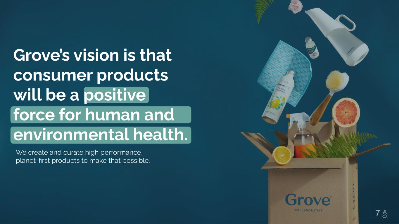 NOTES START FROM HERE AND GROW UP NO CONTENT BELOW THIS LINE CONTENT BELOW THIS LINE SUBTITLE BELOW THIS LINE TITLE CAN NOT GO ABOVE THIS LINE 3 59 76 0 114 88 120 159 144 130 186 128 102 163 157 172 196 200 255 255 255 0 0 0 247 243 228 3 59 76 247 243 228 7 We create and curate high performance, planet-first products to make that possible. Grove’s vision is that consumer products will be a positive force for human and environmental health.