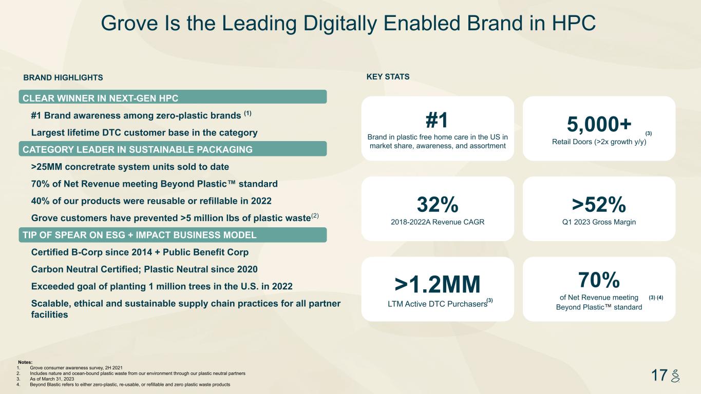 NOTES START FROM HERE AND GROW UP NO CONTENT BELOW THIS LINE CONTENT BELOW THIS LINE SUBTITLE BELOW THIS LINE TITLE CAN NOT GO ABOVE THIS LINE 3 59 76 0 114 88 120 159 144 130 186 128 102 163 157 172 196 200 255 255 255 0 0 0 247 243 228 3 59 76 247 243 228 17 CLEAR WINNER IN NEXT-GEN HPC #1 Brand awareness among zero-plastic brands (1) Largest lifetime DTC customer base in the category CATEGORY LEADER IN SUSTAINABLE PACKAGING >25MM concretrate system units sold to date 70% of Net Revenue meeting Beyond Plastic™ standard 40% of our products were reusable or refillable in 2022 Grove customers have prevented >5 million lbs of plastic waste(2) TIP OF SPEAR ON ESG + IMPACT BUSINESS MODEL Certified B-Corp since 2014 + Public Benefit Corp Carbon Neutral Certified; Plastic Neutral since 2020 Exceeded goal of planting 1 million trees in the U.S. in 2022 Scalable, ethical and sustainable supply chain practices for all partner facilities Grove Is the Leading Digitally Enabled Brand in HPC 32% 2018-2022A Revenue CAGR >1.2MM LTM Active DTC Purchasers >52% Q1 2023 Gross Margin #1 Brand in plastic free home care in the US in market share, awareness, and assortment 70% of Net Revenue meeting Beyond Plastic™ standard 5,000+ Retail Doors (>2x growth y/y) KEY STATSBRAND HIGHLIGHTS Notes: 1. Grove consumer awareness survey, 2H 2021 2. Includes nature and ocean-bound plastic waste from our environment through our plastic neutral partners 3. As of March 31, 2023 4. Beyond Blastic refers to either zero-plastic, re-usable, or refillable and zero plastic waste products (3) (3) (3) (4)