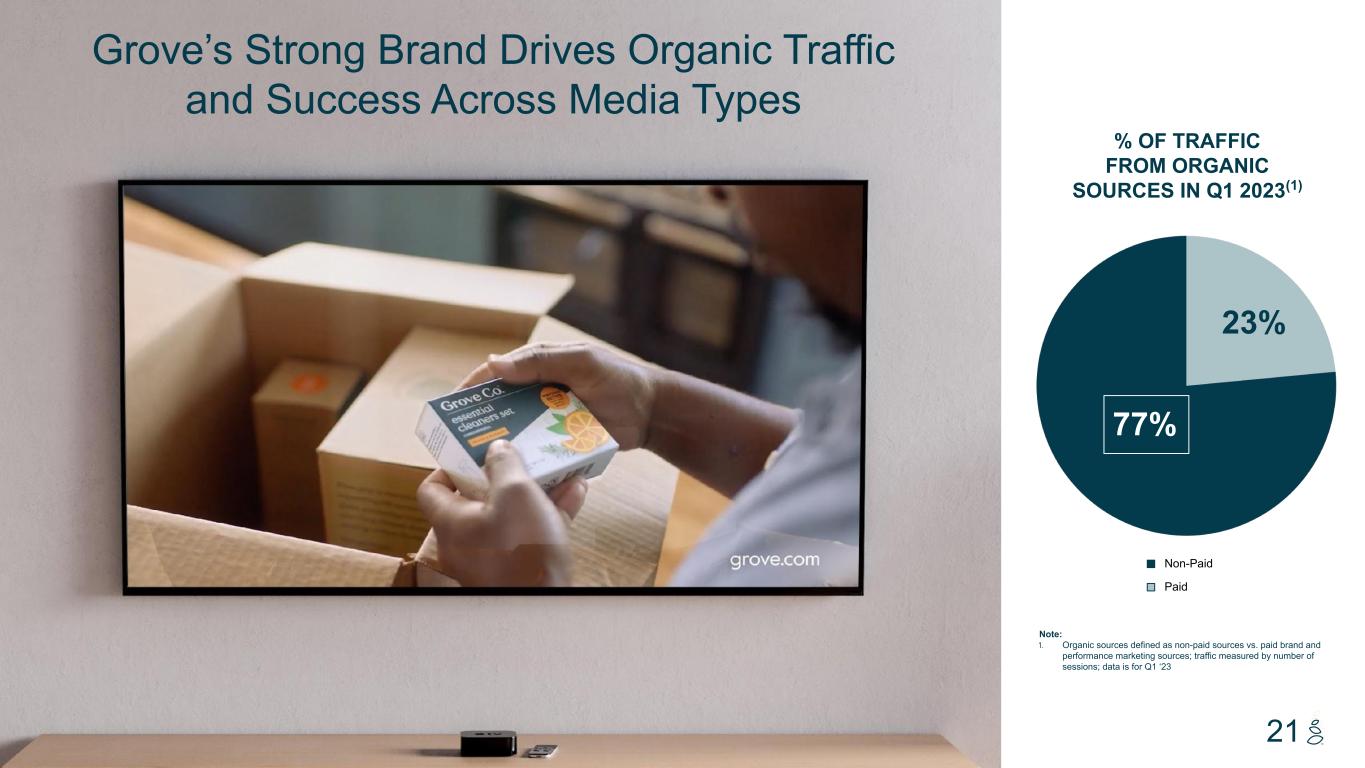 NOTES START FROM HERE AND GROW UP NO CONTENT BELOW THIS LINE CONTENT BELOW THIS LINE SUBTITLE BELOW THIS LINE TITLE CAN NOT GO ABOVE THIS LINE 3 59 76 0 114 88 120 159 144 130 186 128 102 163 157 172 196 200 255 255 255 0 0 0 247 243 228 3 59 76 247 243 228 3 Trademarks Grove owns or has rights to various trademarks, service marks and trade names that it uses in connection with the operation of its business. This Presentation may also contain trademarks, service marks, trade names and copyrights of third parties, which are the property of their respective owners. The use or display of third parties’ trademarks, service marks, trade names or products in this Presentation is not intended to, and does not imply, a relationship with Grove, or an endorsement or sponsorship by or of Grove. Solely for convenience, the trademarks, service marks, trade names and copyrights referred to in this Presentation may appear without the TM, SM, ® or © symbols, but such references are not intended to indicate, in any way, that Grove will not assert, to the fullest extent under applicable law, its rights or the right of the applicable licensor to these trademarks, service marks, trade names and copyrights. Use of Projections This Presentation contains projected financial information with respect to Grove, namely revenue and gross margin, Grove brands revenue share, net revenue share by brand, gross profit, adjusted EBITDA, adjusted EBITDA margin, fulfillment cost, operating expenses, advertising spend. Such projected financial information constitutes forward-looking information, and is for illustrative purposes only and should not be relied upon as necessarily being indicative of future results. The projections, estimates and targets in this Presentation are forward-looking statements that are based on assumptions that are inherently subject to significant uncertainties and contingencies, many of which are beyond Grove’s control. See “Forward-Looking Statements” above. While all projections, estimates and targets are necessarily speculative, Grove believes that the preparation of prospective financial information involves increasingly higher levels of uncertainty the further out the projection, estimate or target extends from the date of preparation. The assumptions and estimates underlying the projected, expected or target results are inherently uncertain and are subject to a wide variety of significant business, economic, regulatory, competitive and other risks and uncertainties that could cause actual results to differ materially from those contained in such projections, estimates and targets. The inclusion of projections, estimates and targets in this Presentation should not be regarded as an indication that Grove, or its representatives, considered or consider the financial projections, estimates and targets to be a reliable prediction of future events. The independent registered public accounting firm of Grove has not audited, reviewed, compiled or performed any procedures with respect to the projections for the purpose of their inclusion in this Presentation, and accordingly, neither of them expressed an opinion or provided any other form of assurance with respect thereto for the purpose of this Presentation. Financial Information; Non-GAAP Financial Measures The Grove financial information and data for the fiscal years ended December 31, 2019, 2020, 2021 and 2022 included herein are audited in accordance with Public Company Accounting Oversight Board (PCAOB) audit standards. Grove financial information for 2023 reflects unaudited financial information or management estimates. Some of the financial information and data contained in this Presentation, such as adjusted gross margin, adjusted selling, general, and administrative and product development expenses, and adjusted EBITDA, have not been prepared in accordance with United States generally accepted accounting principles (“GAAP”). These non-GAAP measures, and other measures that are calculated using such non-GAAP measures, are an addition to, and not a substitute for or superior to, measures of financial performance prepared in accordance with GAAP and should not be considered as an alternative to revenue, operating income, profit before tax, net income or any other performance measures derived in accordance with GAAP. A reconciliation of adjusted EBITDA to Net Income is provided at the end of this presentation. A reconciliation of the projected non-GAAP financial measures has not been provided and is unable to be provided without unreasonable effort because certain items excluded from these non-GAAP financial measures such as charges related to stock-based compensation expenses and related tax effects, including non-recurring income tax adjustments, cannot be reasonably calculated or predicted at this time. Grove believes these non-GAAP measures of financial results, including on a forward-looking basis, provide useful information to management and investors regarding certain financial and business trends relating to Grove’s financial condition and results of operations. Grove’s management uses these non-GAAP measures for trend analyses and for budgeting and planning purposes. Grove believes that the use of these non-GAAP financial measures provide an additional tool for investors to use in evaluating projected operating results and trends in and in comparing Grove’s financial measures with other similar companies, many of which present similar non-GAAP financial measures to investors. However, there are a number of limitations related to the use of these non-GAAP measures and their nearest GAAP equivalents. For example, other companies may calculate non-GAAP measures differently, or may use other measures to calculate their financial performance, and therefore Grove’s non-GAAP measures may not be directly comparable to similarly titled measures of other companies. See the footnotes on the slides where these measures are di