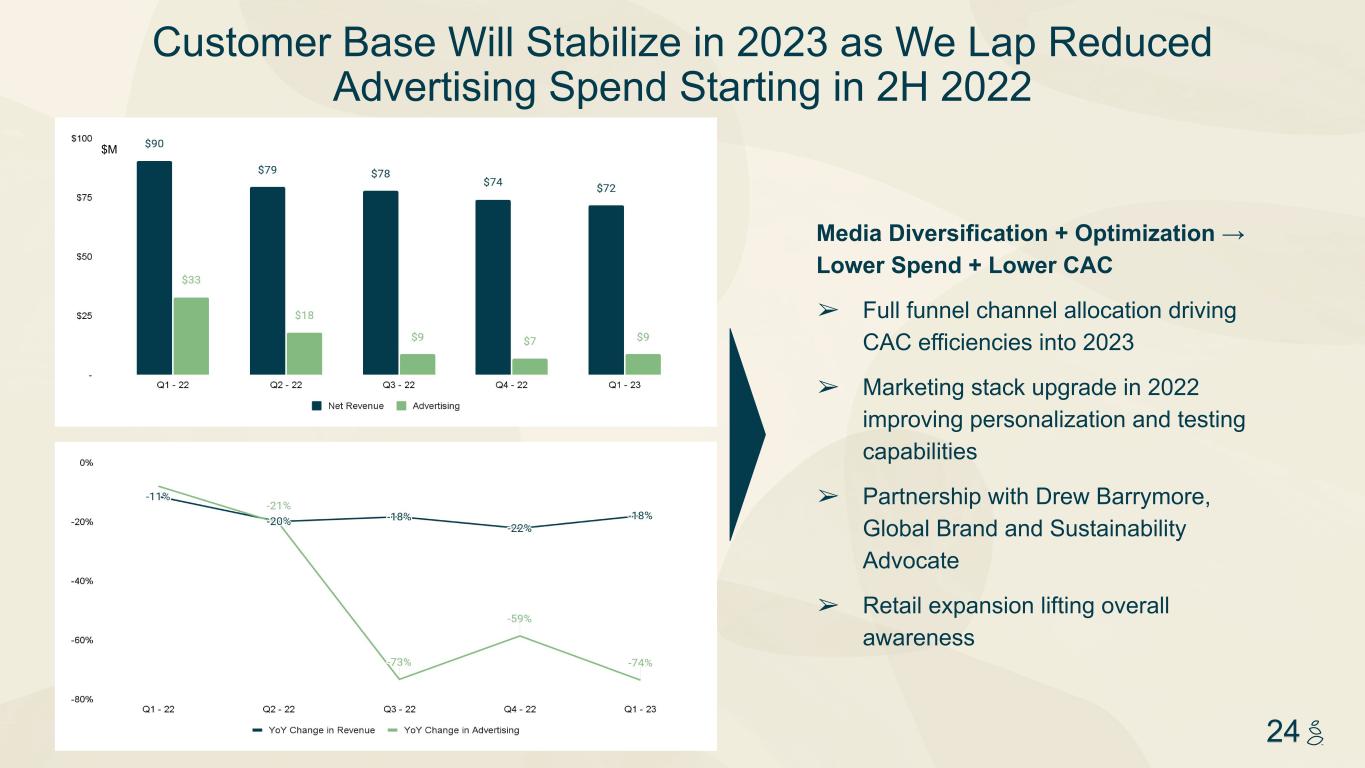 NOTES START FROM HERE AND GROW UP NO CONTENT BELOW THIS LINE CONTENT BELOW THIS LINE SUBTITLE BELOW THIS LINE TITLE CAN NOT GO ABOVE THIS LINE 3 59 76 0 114 88 120 159 144 130 186 128 102 163 157 172 196 200 255 255 255 0 0 0 247 243 228 3 59 76 247 243 228 24 Customer Base Will Stabilize in 2023 as We Lap Reduced Advertising Spend Starting in 2H 2022 Media Diversification + Optimization → Lower Spend + Lower CAC ➢ Full funnel channel allocation driving CAC efficiencies into 2023 ➢ Marketing stack upgrade in 2022 improving personalization and testing capabilities ➢ Partnership with Drew Barrymore, Global Brand and Sustainability Advocate ➢ Retail expansion lifting overall awareness $M