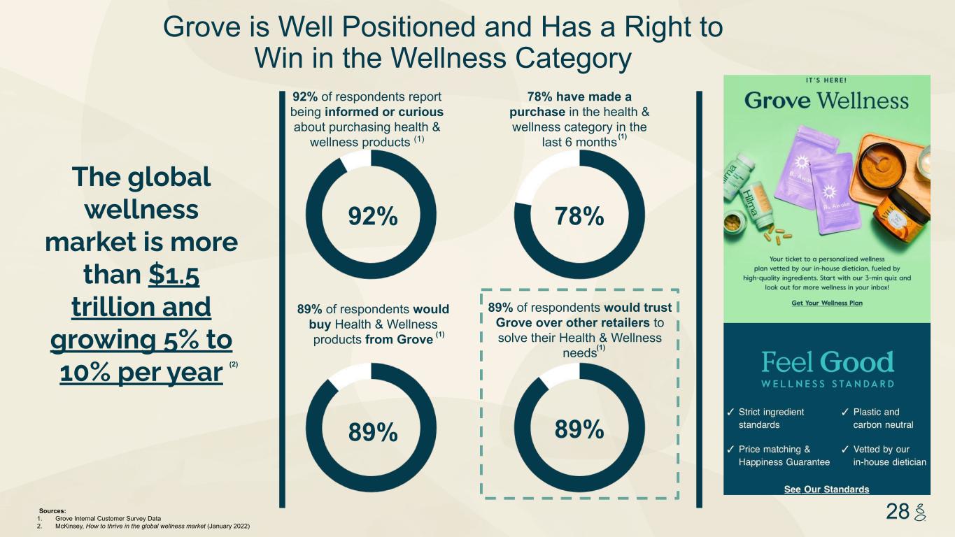 NOTES START FROM HERE AND GROW UP NO CONTENT BELOW THIS LINE CONTENT BELOW THIS LINE SUBTITLE BELOW THIS LINE TITLE CAN NOT GO ABOVE THIS LINE 3 59 76 0 114 88 120 159 144 130 186 128 102 163 157 172 196 200 255 255 255 0 0 0 247 243 228 3 59 76 247 243 228 28 89% of respondents would trust Grove over other retailers to solve their Health & Wellness needs Grove is Well Positioned and Has a Right to Win in the Wellness Category 89% 92% of respondents report being informed or curious about purchasing health & wellness products (1) 89% 89% of respondents would buy Health & Wellness products from Grove 92% 78% 78% have made a purchase in the health & wellness category in the last 6 months Sources: 1. Grove Internal Customer Survey Data 2. McKinsey, How to thrive in the global wellness market (January 2022) The global wellness market is more than $1.5 trillion and growing 5% to 10% per year (2) (1) (1) (1)