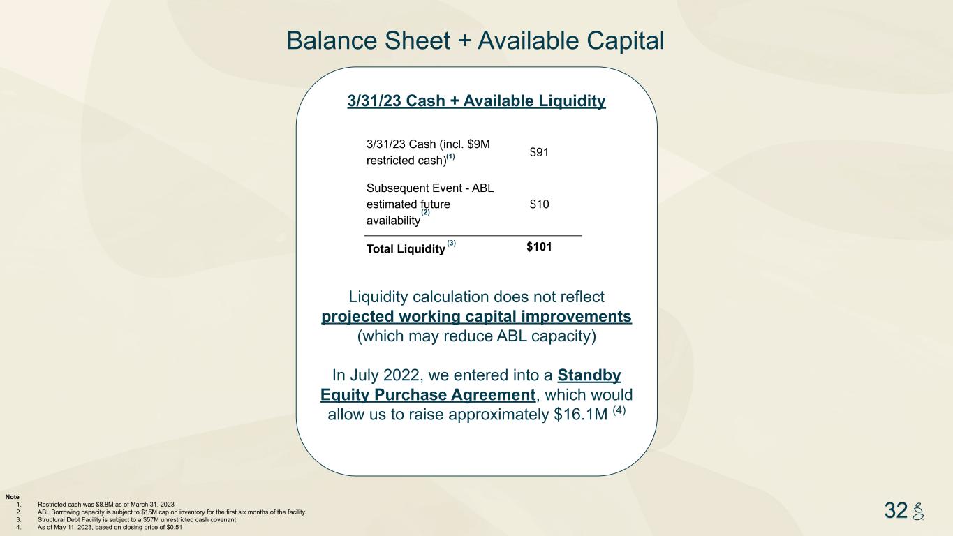 NOTES START FROM HERE AND GROW UP NO CONTENT BELOW THIS LINE CONTENT BELOW THIS LINE SUBTITLE BELOW THIS LINE TITLE CAN NOT GO ABOVE THIS LINE 3 59 76 0 114 88 120 159 144 130 186 128 102 163 157 172 196 200 255 255 255 0 0 0 247 243 228 3 59 76 247 243 228 32 3/31/23 Cash + Available Liquidity Liquidity calculation does not reflect projected working capital improvements (which may reduce ABL capacity) In July 2022, we entered into a Standby Equity Purchase Agreement, which would allow us to raise approximately $16.1M (4) 3/31/23 Cash (incl. $9M restricted cash) $91 Subsequent Event - ABL estimated future availability $10 Total Liquidity $101 Balance Sheet + Available Capital Note 1. Restricted cash was $8.8M as of March 31, 2023 2. ABL Borrowing capacity is subject to $15M cap on inventory for the first six months of the facility. 3. Structural Debt Facility is subject to a $57M unrestricted cash covenant 4. As of May 11, 2023, based on closing price of $0.51 (2) (3) (1)