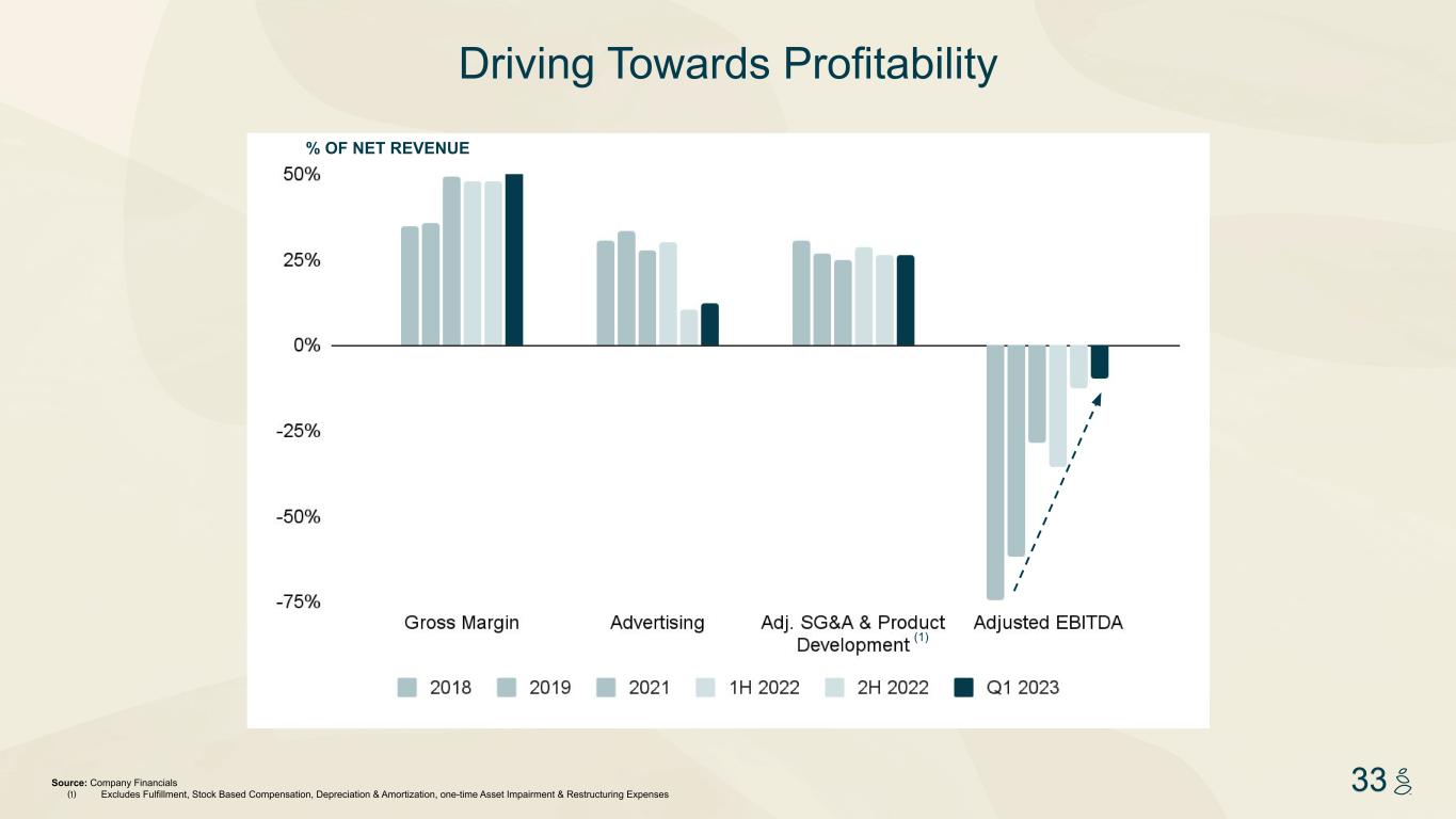 NOTES START FROM HERE AND GROW UP NO CONTENT BELOW THIS LINE CONTENT BELOW THIS LINE SUBTITLE BELOW THIS LINE TITLE CAN NOT GO ABOVE THIS LINE 3 59 76 0 114 88 120 159 144 130 186 128 102 163 157 172 196 200 255 255 255 0 0 0 247 243 228 3 59 76 247 243 228 33Source: Company Financials (1) Excludes Fulfillment, Stock Based Compensation, Depreciation & Amortization, one-time Asset Impairment & Restructuring Expenses % OF NET REVENUE Driving Towards Profitability (1)