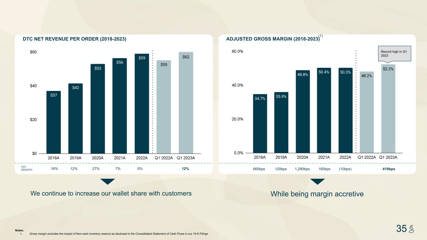 NOTES START FROM HERE AND GROW UP NO CONTENT BELOW THIS LINE CONTENT BELOW THIS LINE SUBTITLE BELOW THIS LINE TITLE CAN NOT GO ABOVE THIS LINE 3 59 76 0 114 88 120 159 144 130 186 128 102 163 157 172 196 200 255 255 255 0 0 0 247 243 228 3 59 76 247 243 228 35 DTC NET REVENUE PER ORDER (2018-2023) Notes: 1. Gross margin excludes the impact of Non-cash inventory reserve as disclosed in the Consolidated Statement of Cash Flows in our 10-K Filings We continue to increase our wallet share with customers ADJUSTED GROSS MARGIN (2018-2023) While being margin accretive YOY GROWTH: (1) 16% 12% 27% 7% 5% 660bps 120bps 1,290bps 160bps (10bps) Record high in Q1 2023 410bps12%