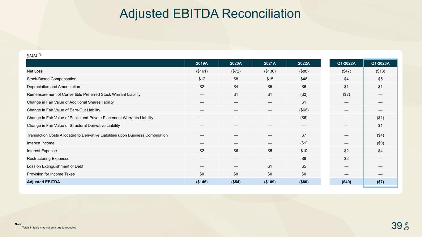 NOTES START FROM HERE AND GROW UP NO CONTENT BELOW THIS LINE CONTENT BELOW THIS LINE SUBTITLE BELOW THIS LINE TITLE CAN NOT GO ABOVE THIS LINE 3 59 76 0 114 88 120 159 144 130 186 128 102 163 157 172 196 200 255 255 255 0 0 0 247 243 228 3 59 76 247 243 228 39 Adjusted EBITDA Reconciliation $MM (1) Note: 1. Totals in table may not sum due to rounding 2019A 2020A 2021A 2022A Q1-2022A Q1-2023A Net Loss ($161) ($72) ($136) ($88) ($47) ($13) Stock-Based Compensation $12 $8 $15 $46 $4 $5 Depreciation and Amortization $2 $4 $5 $6 $1 $1 Remeasurement of Convertible Preferred Stock Warrant Liability — $1 $1 ($2) ($2) — Change in Fair Value of Additional Shares liability — — — $1 — — Change in Fair Value of Earn-Out Liability — — — ($66) — — Change in Fair Value of Public and Private Placement Warrants Liability — — — ($6) — ($1) Change in Fair Value of Structural Derivative Liability — — — — — $1 Transaction Costs Allocated to Derivative Liabilities upon Business Combination — — — $7 — ($4) Interest Income — — — ($1) — ($0) Interest Expense $2 $6 $5 $10 $2 $4 Restructuring Expenses — — — $9 $2 — Loss on Extinguishment of Debt — — $1 $5 — — Provision for Income Taxes $0 $0 $0 $0 — — Adjusted EBITDA ($145) ($54) ($109) ($80) ($40) ($7)