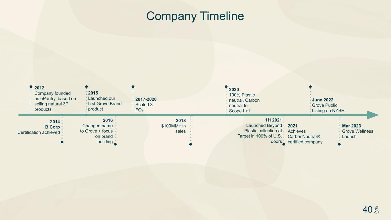 NOTES START FROM HERE AND GROW UP NO CONTENT BELOW THIS LINE CONTENT BELOW THIS LINE SUBTITLE BELOW THIS LINE TITLE CAN NOT GO ABOVE THIS LINE 3 59 76 0 114 88 120 159 144 130 186 128 102 163 157 172 196 200 255 255 255 0 0 0 247 243 228 3 59 76 247 243 228 40 Company Timeline 2016 Changed name to Grove + focus on brand building 1H 2021 Launched Beyond Plastic collection at Target in 100% of U.S. doors 2012 Company founded as ePantry, based on selling natural 3P products 2014 B Corp Certification achieved 2015 Launched our first Grove Brand product 2017-2020 Scaled 3 FCs 2020 100% Plastic neutral, Carbon neutral for Scope I + II June 2022 Grove Public Listing on NYSE 2018 $100MM+ in sales 2021 Achieves CarbonNeutral® certified company Mar 2023 Grove Wellness Launch