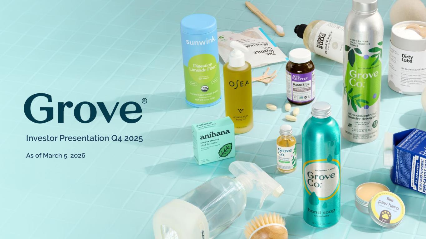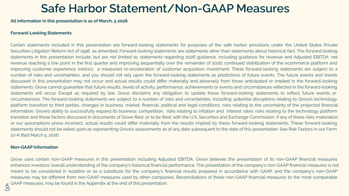 All information in this presentation is as of March, 5 2026. Forward-Looking Statements Certain statements included in this presentation are forward-looking statements for purposes of the safe harbor provisions under the United States Private Securities Litigation Reform Act of 1996, as amended. Forward-looking statements are statements other than statements about historical fact. The forward looking statements in this presentation include, but are not limited to, statements regarding 2026 guidance, including guidance for revenue and Adjusted EBITDA; net revenue reaching a low point in the first quarter and improving sequentially over the remainder of 2026; continued stabilization of the ecommerce platform and improving customer experience metrics; a measured re-acceleration of customer acquisition investment. These forward-looking statements are subject to a number of risks and uncertainties, and you should not rely upon the forward-looking statements as predictions of future events. The future events and trends discussed in this presentation may not occur and actual results could differ materially and adversely from those anticipated or implied in the forward-looking statements. Grove cannot guarantee that future results, levels of activity, performance, achievements or events and circumstances reflected in the forward-looking statements will occur. Except as required by law, Grove disclaims any obligation to update these forward-looking statements to reflect future events or circumstances. The forward-looking statements are subject to a number of risks and uncertainties, including: potential disruptions relating to Grove’s technology platform transition to third parties, changes in business, market, financial, political and legal conditions; risks relating to the uncertainty of the projected financial information; Grove’s ability to successfully expand its business; competition; risks relating to inflation and interest rates; risks relating to the technology platform transition and those factors discussed in documents of Grove filed, or to be filed, with the U.S. Securities and Exchange Commission. If any of these risks materialize or our assumptions prove incorrect, actual results could differ materially from the results implied by these forward-looking statements. These forward-looking statements should not be relied upon as representing Grove’s assessments as of any date subsequent to the date of this presentation. See Risk Factors in our Form 10-K filed March 5, 2026. Non-GAAP Information Grove uses certain non-GAAP measures in this presentation including Adjusted EBITDA. Grove believes the presentation of its non-GAAP financial measures enhances investors' overall understanding of the company's historical financial performance. The presentation of the company's non-GAAP financial measures is not meant to be considered in isolation or as a substitute for the company's financial results prepared in accordance with GAAP, and the company's non-GAAP measures may be different from non-GAAP measures used by other companies. Reconciliations of these non-GAAP financial measures to the most comparable GAAP measures, may be found in the Appendix at the end of this presentation. Safe Harbor Statement/Non-GAAP Measures