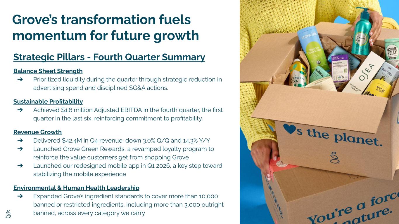 Grove’s transformation fuels momentum for future growth Strategic Pillars - Fourth Quarter Summary Balance Sheet Strength ➔ Prioritized liquidity during the quarter through strategic reduction in advertising spend and disciplined SG&A actions. Sustainable Profitability ➔ Achieved $1.6 million Adjusted EBITDA in the fourth quarter, the first quarter in the last six, reinforcing commitment to profitability. Revenue Growth ➔ Delivered $42.4M in Q4 revenue, down 3.0% Q/Q and 14.3% Y/Y ➔ Launched Grove Green Rewards, a revamped loyalty program to reinforce the value customers get from shopping Grove ➔ Launched our redesigned mobile app in Q1 2026, a key step toward stabilizing the mobile experience Environmental & Human Health Leadership ➔ Expanded Grove’s ingredient standards to cover more than 10,000 banned or restricted ingredients, including more than 3,000 outright banned, across every category we carry