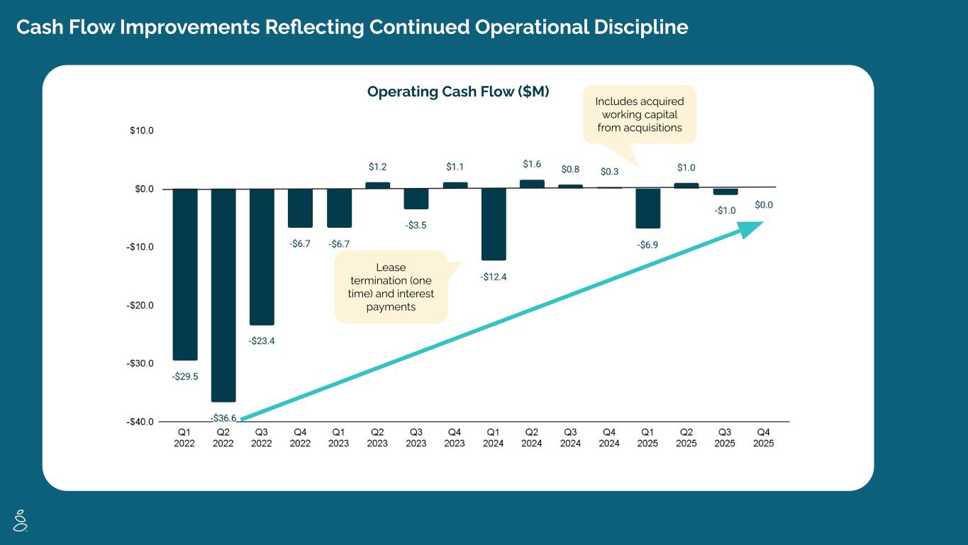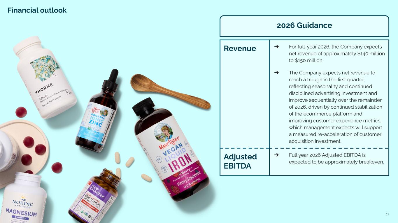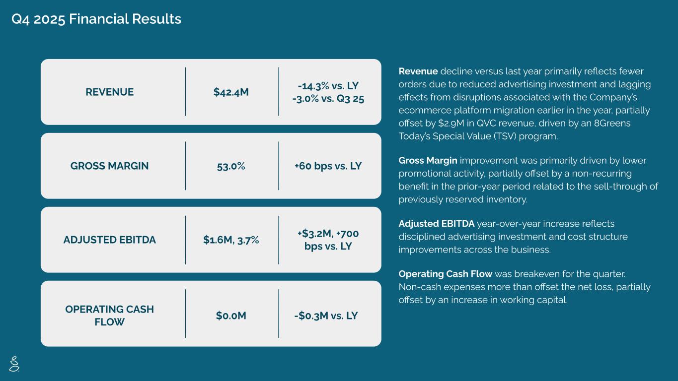 Q4 2025 Financial Results ADJUSTED EBITDA GROSS MARGIN REVENUE $42.4M -14.3% vs. LY -3.0% vs. Q3 25 53.0% +60 bps vs. LY $1.6M, 3.7% +$3.2M, +700 bps vs. LY $0.0M -$0.3M vs. LY Revenue decline versus last year primarily reflects fewer orders due to reduced advertising investment and lagging effects from disruptions associated with the Company’s ecommerce platform migration earlier in the year, partially offset by $2.9M in QVC revenue, driven by an 8Greens Today’s Special Value (TSV) program. Gross Margin improvement was primarily driven by lower promotional activity, partially offset by a non-recurring benefit in the prior-year period related to the sell-through of previously reserved inventory. Adjusted EBITDA year-over-year increase reflects disciplined advertising investment and cost structure improvements across the business. Operating Cash Flow was breakeven for the quarter. Non-cash expenses more than offset the net loss, partially offset by an increase in working capital. OPERATING CASH FLOW